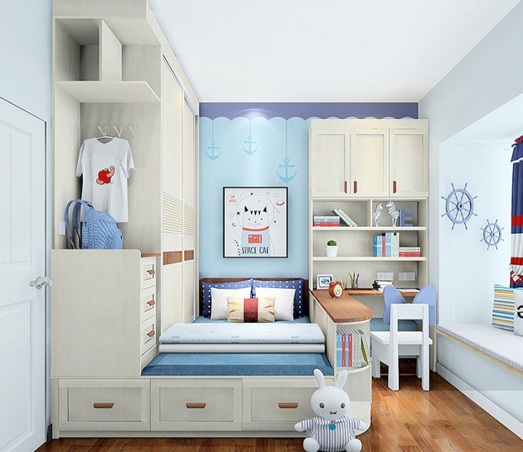 榻榻米床、衣柜和书桌柜的组合式设计,也能满足小户型儿童房的所有需求,比如收纳、睡眠和做作业等等。
