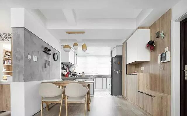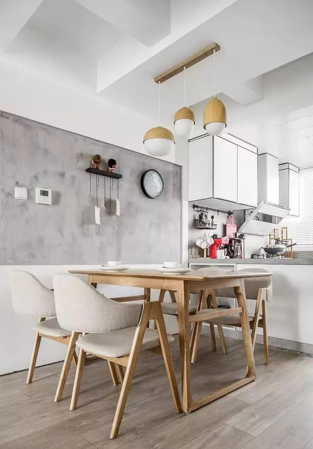 为了避免单调,在灰色墙壁上设计了小搁板,挂上一些小饰品,圆形的时钟方便厨房烹饪的人看时间,把握好每一道菜肴的烹饪最佳时间,精致地过好每一天。