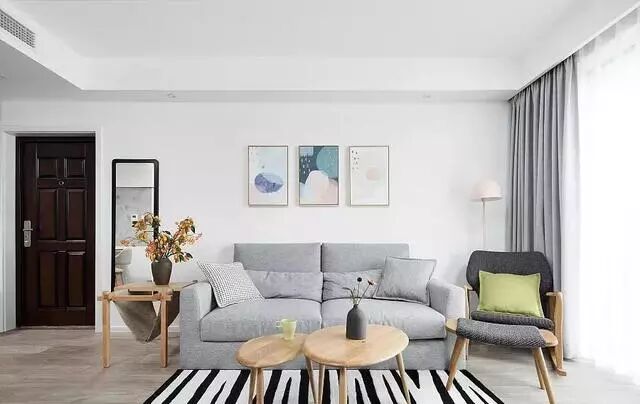 灰色是黑白的过渡色,肩负着和偕自然的角色,把黑与白反差缓冲了。灰色的布艺沙发,与黑白条纹的地毯在颜色上形成鲜明对比。
