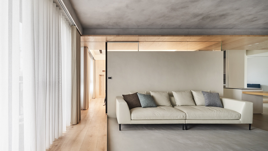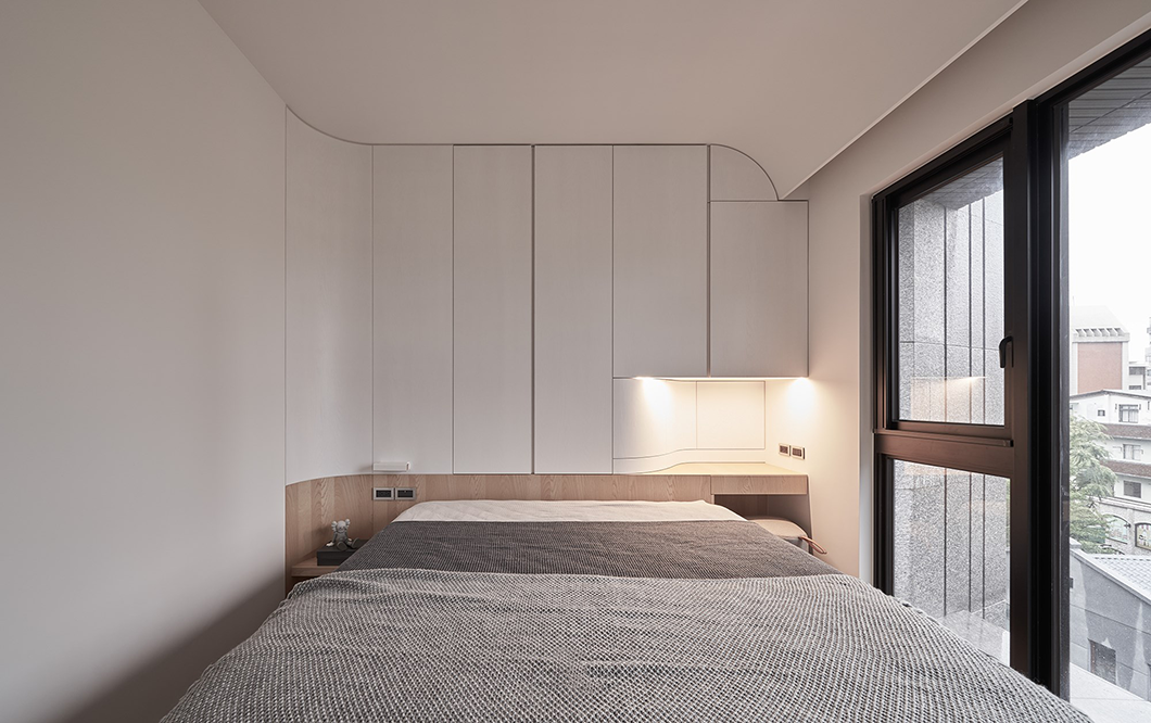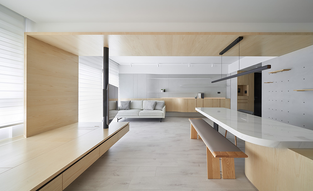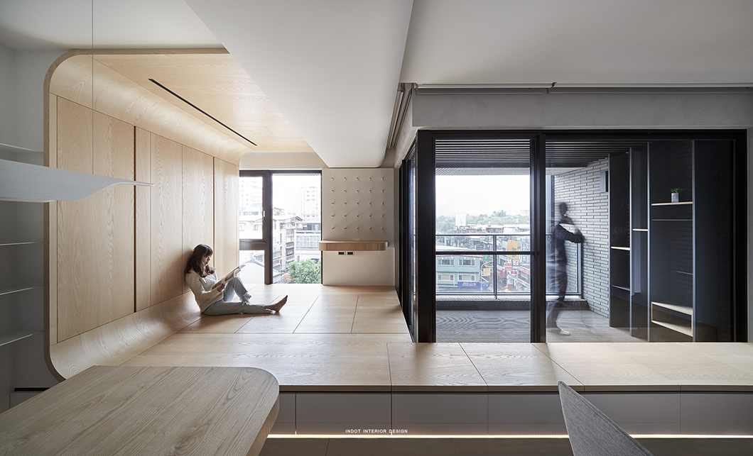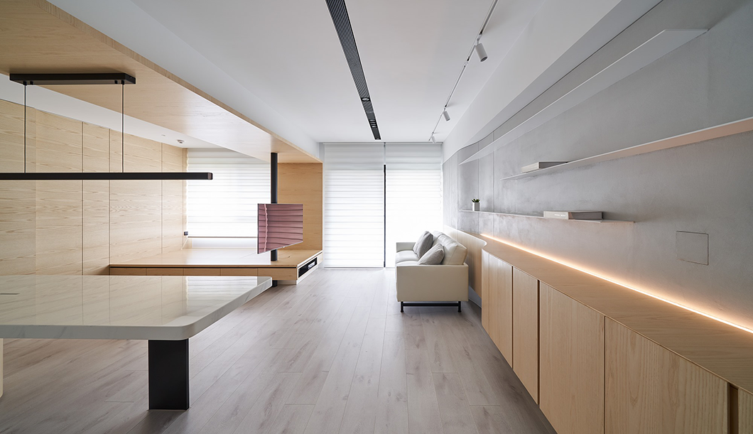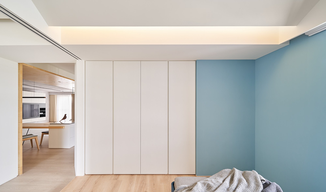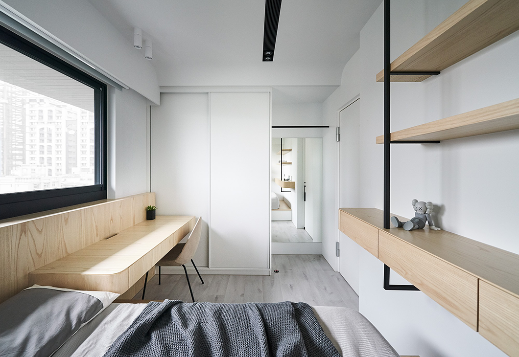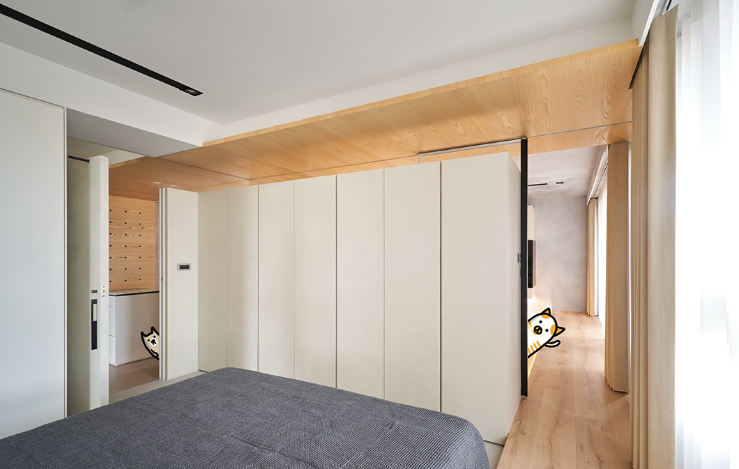 屋内原始梁很低,所以设计师用木皮折板修饰,从地板材质延伸到天花,让主卧跟客厅的隔间墙不到顶,营造一种墙板脱开的穿透感,窗边光廊动线留出,形成设计师擅长的回字形动线。