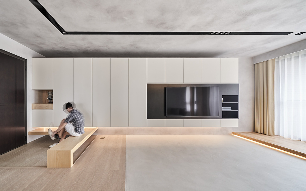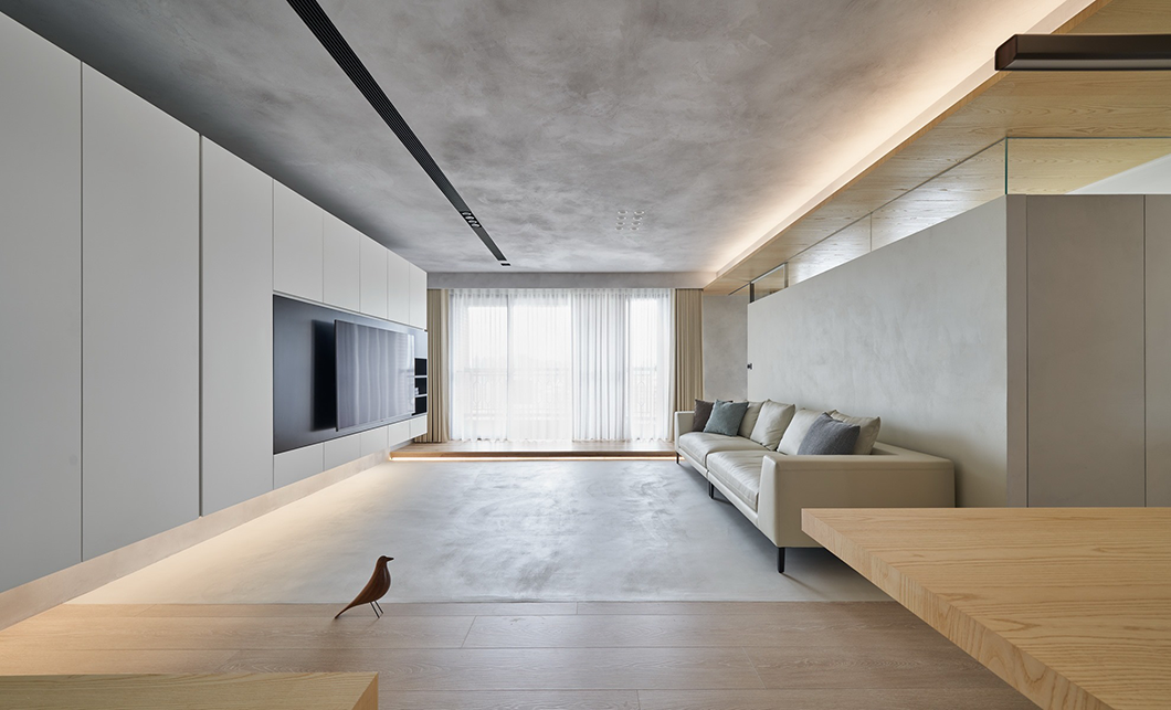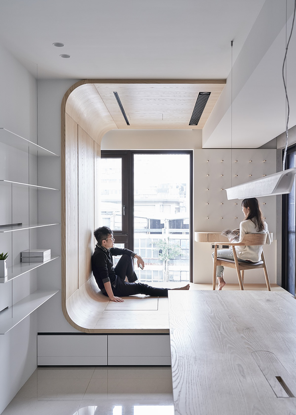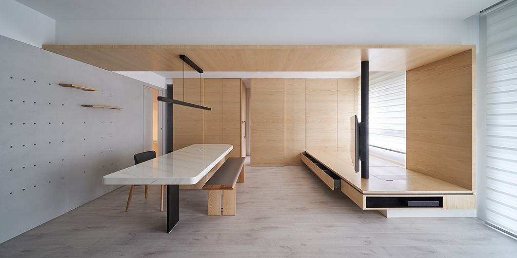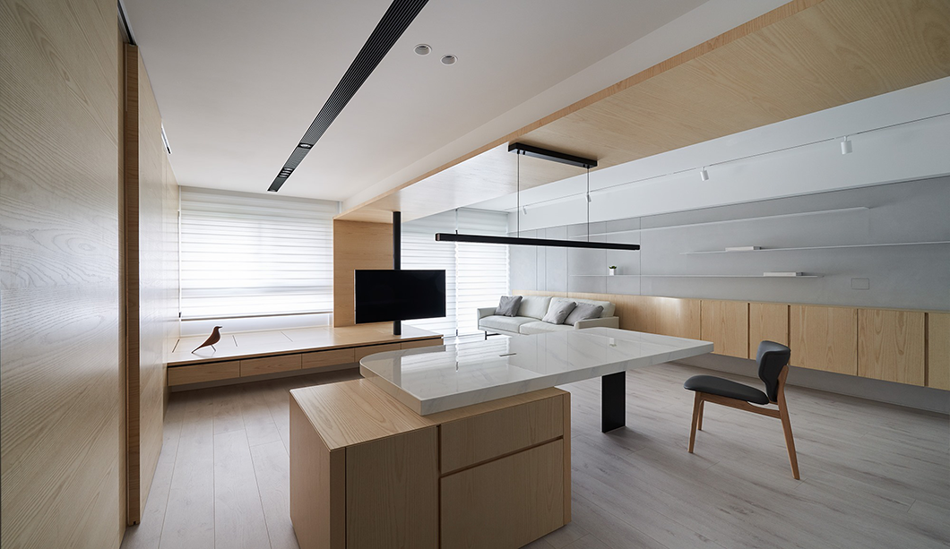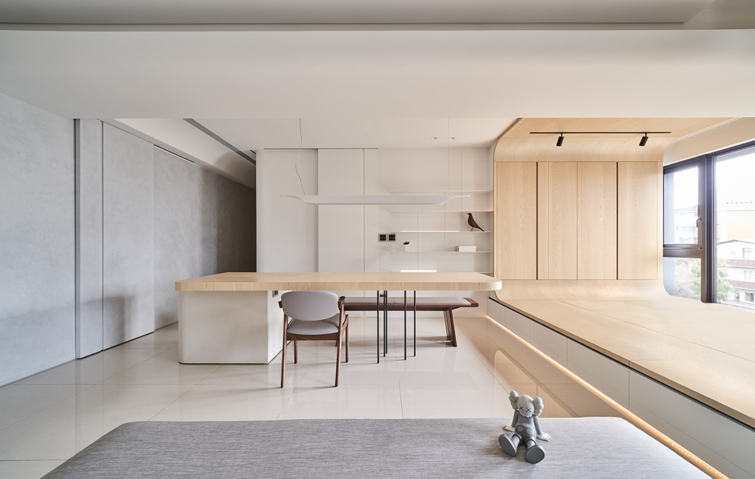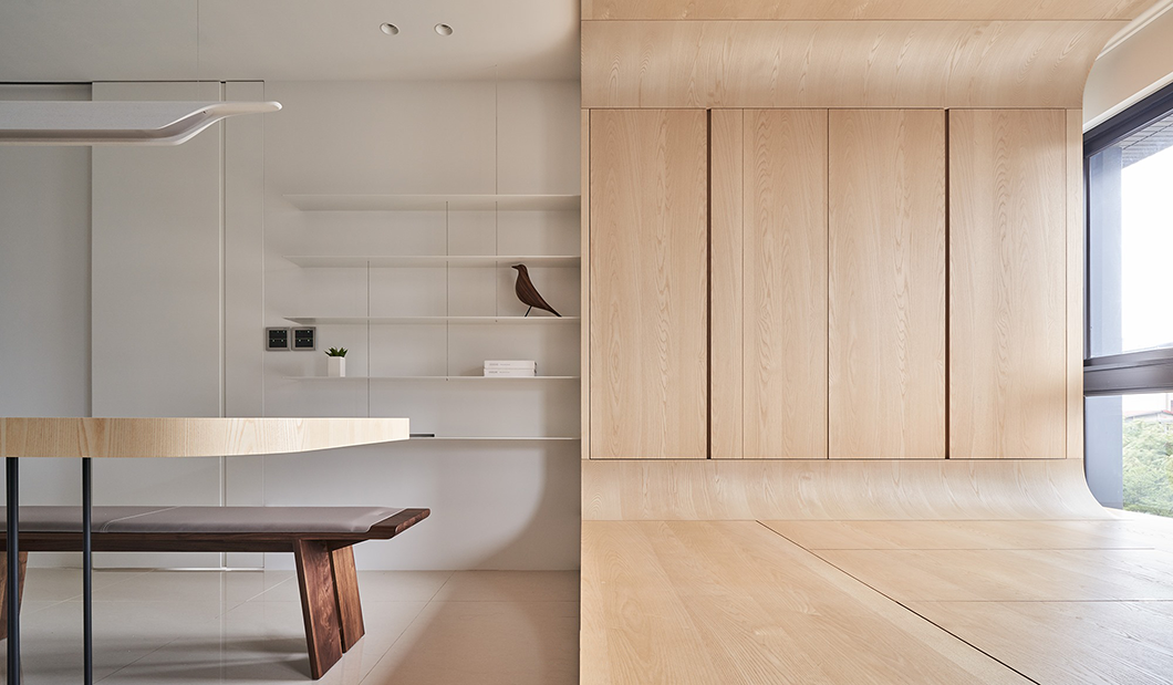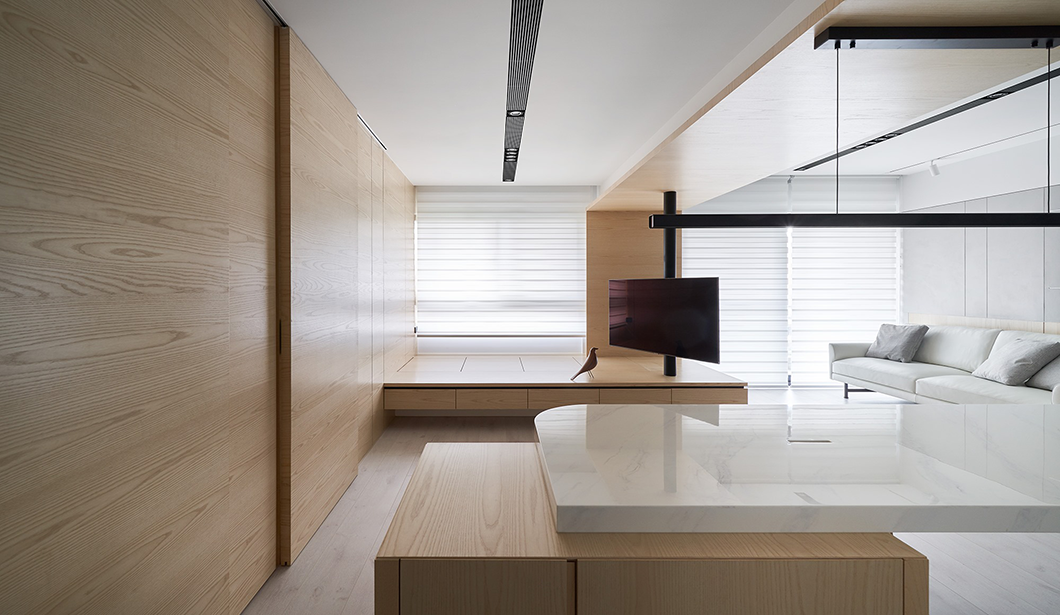 屋内原始梁很低,所以设计师用木皮折板修饰,从地板材质延伸到天花,让主卧跟客厅的隔间墙不到顶,营造一种墙板脱开的穿透感,窗边光廊动线留出,形成设计师擅长的回字形动线。