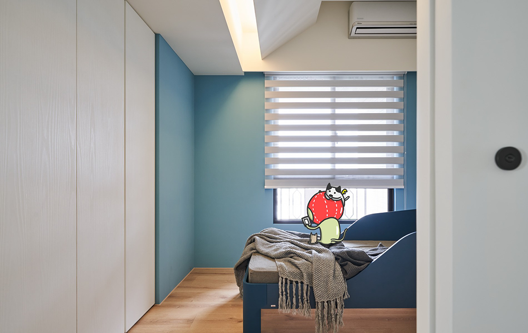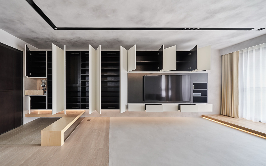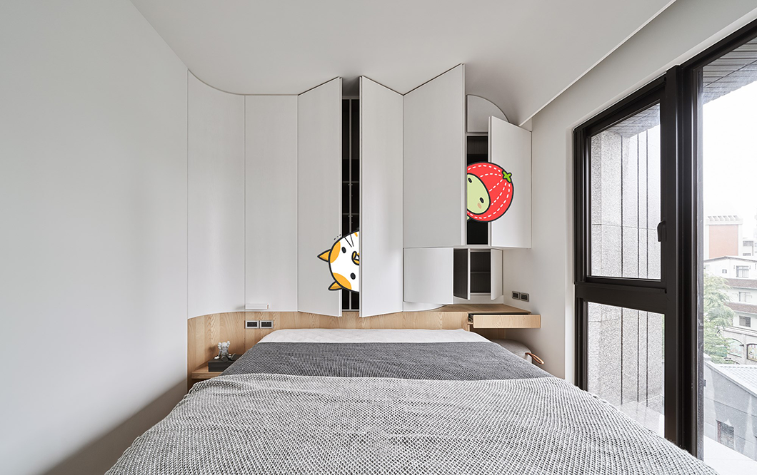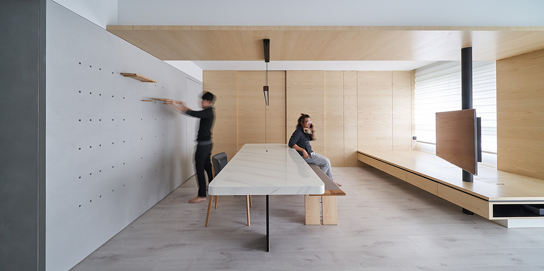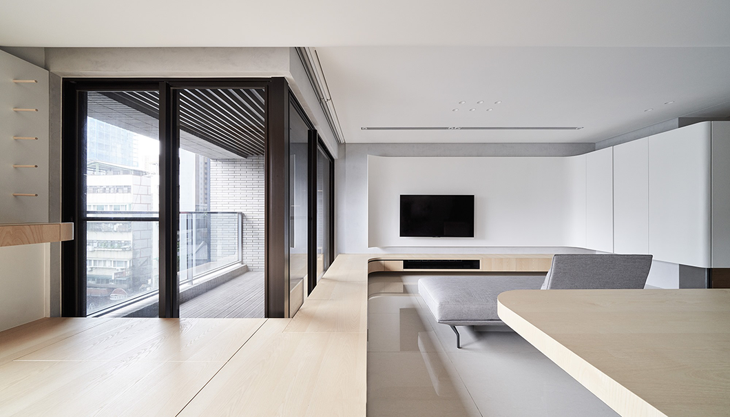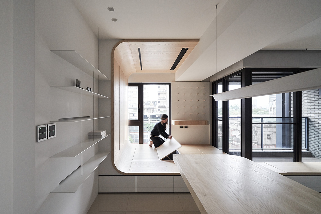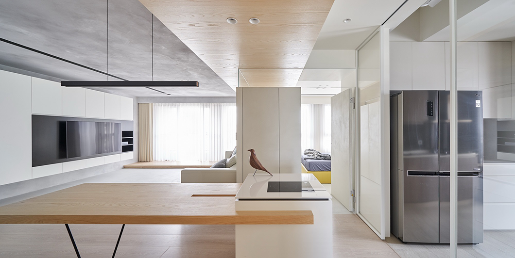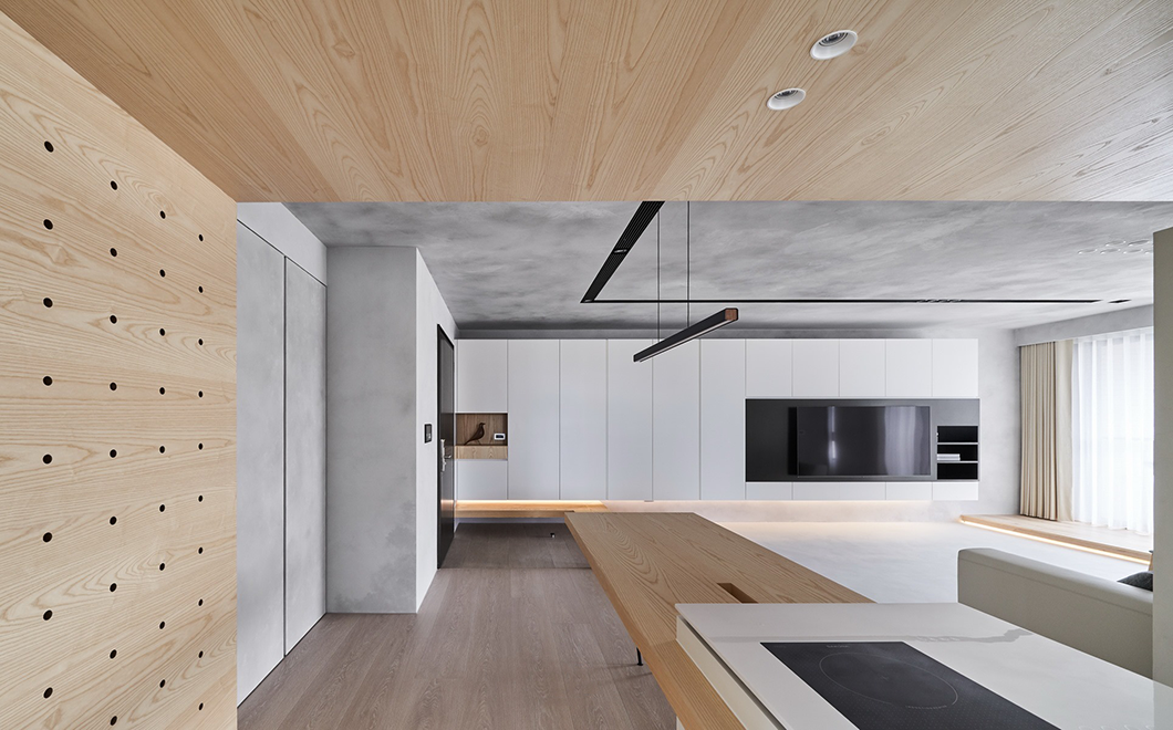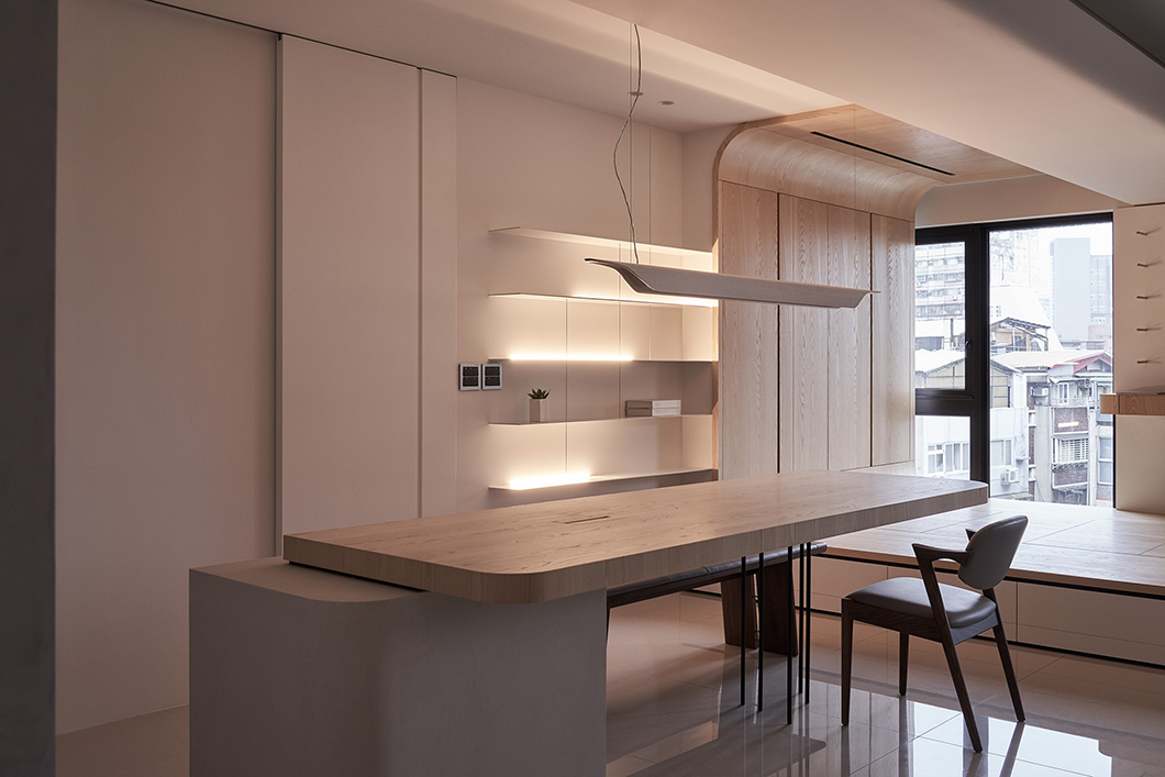 屋内原始梁很低,所以设计师用木皮折板修饰,从地板材质延伸到天花,让主卧跟客厅的隔间墙不到顶,营造一种墙板脱开的穿透感,窗边光廊动线留出,形成设计师擅长的回字形动线。