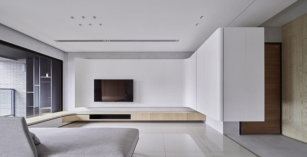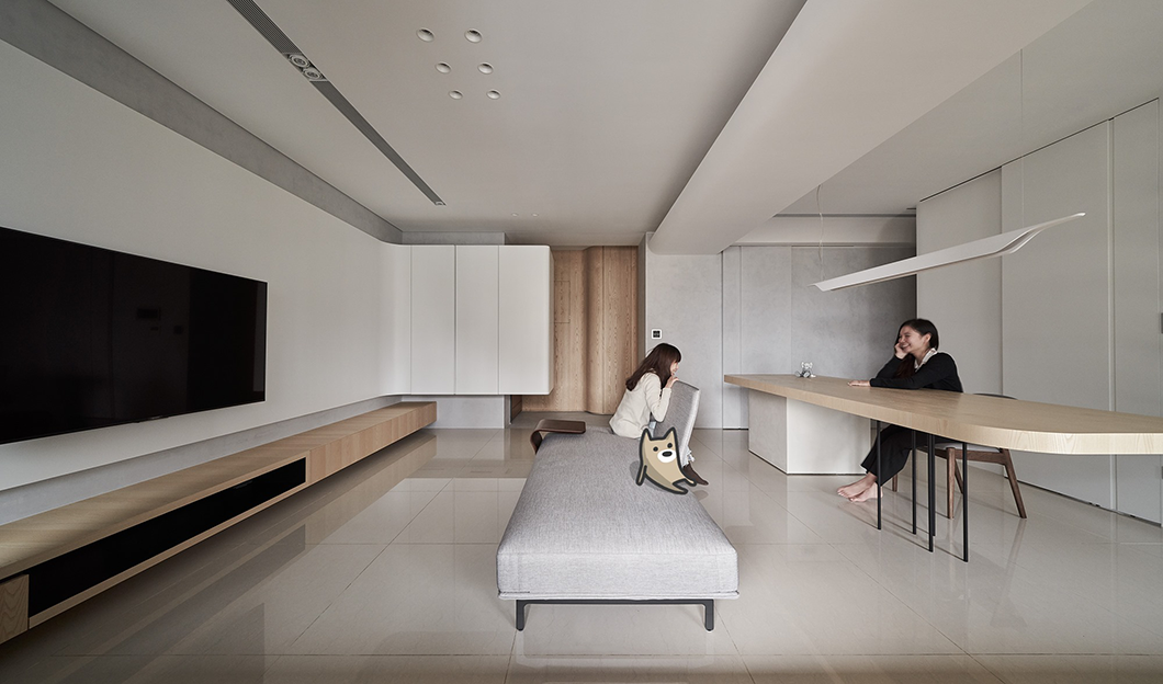24坪住宅居住成员为两大一小,因为客户很喜欢简洁的空间,所以也希望家里能够很简约的设计,另外客户希望公共空间能够尽量开放,希望可以到处都能看到电视。