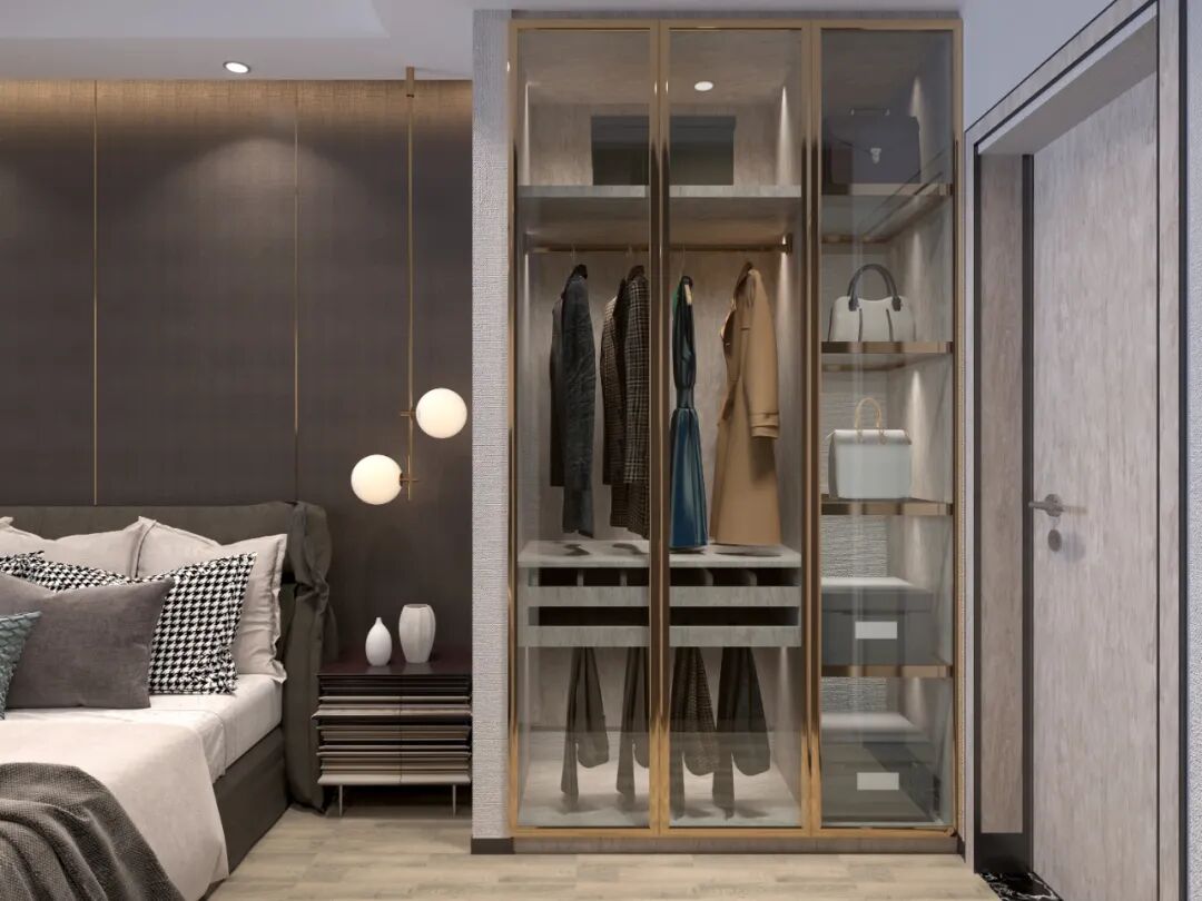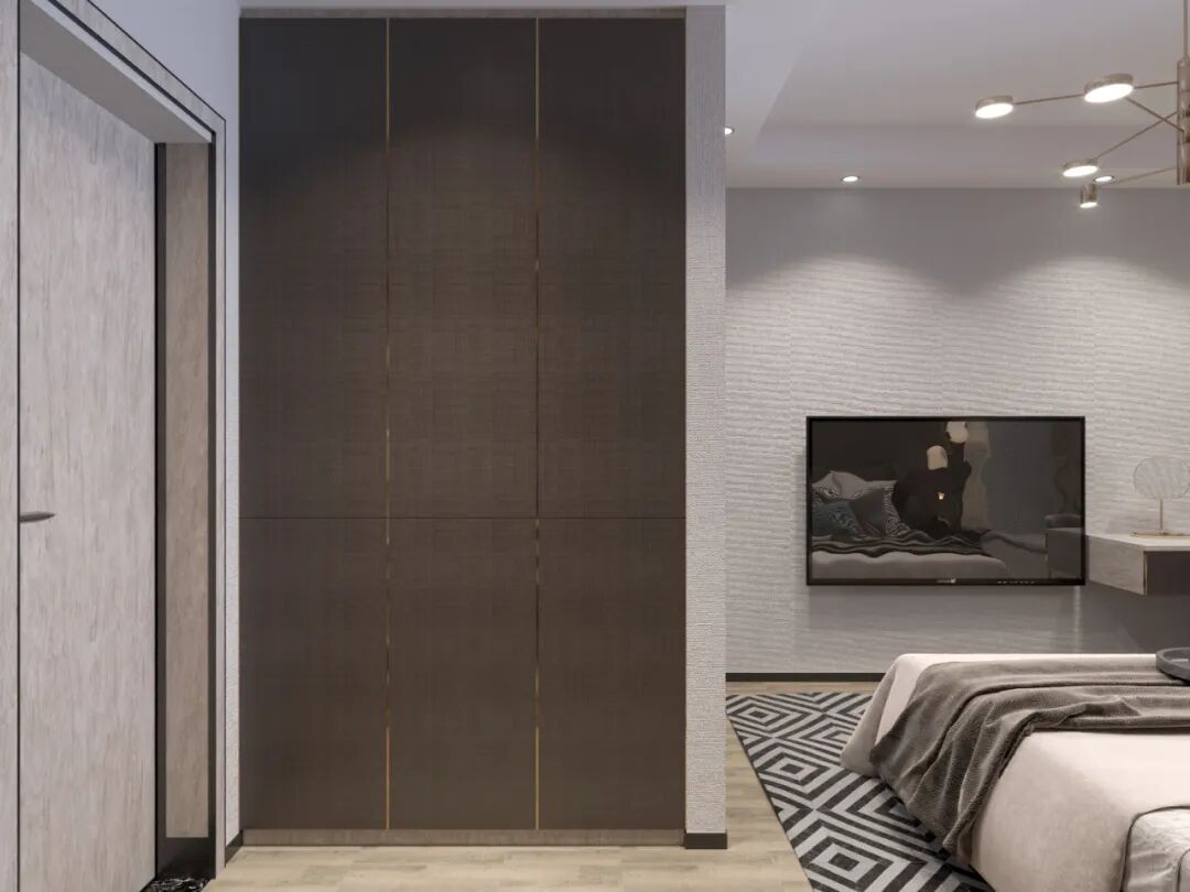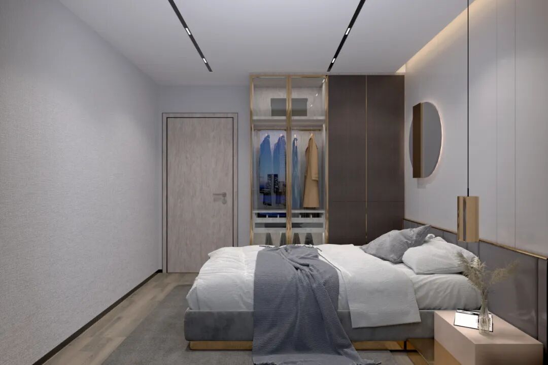 主卧的柜体门板与床头采用加州爵枫的花色设计,奢华的棕色系以富有质感的金属点缀,展现出都市人的追求。衣柜设计在门口两侧相对而立,并且一边采用封闭式设计,一边为玻璃掩门设计的可视区域,让衣物的管理更加便利。