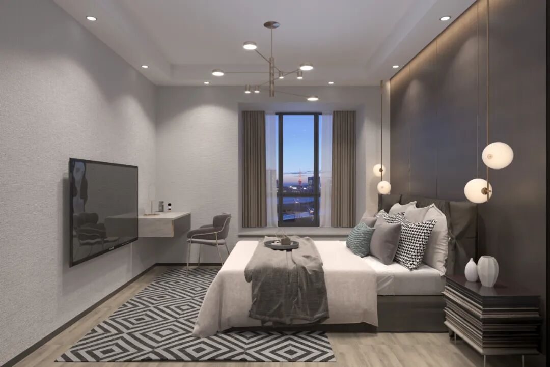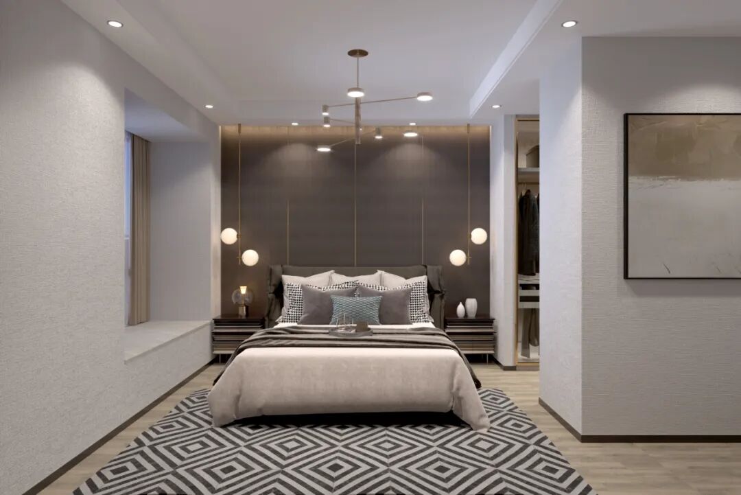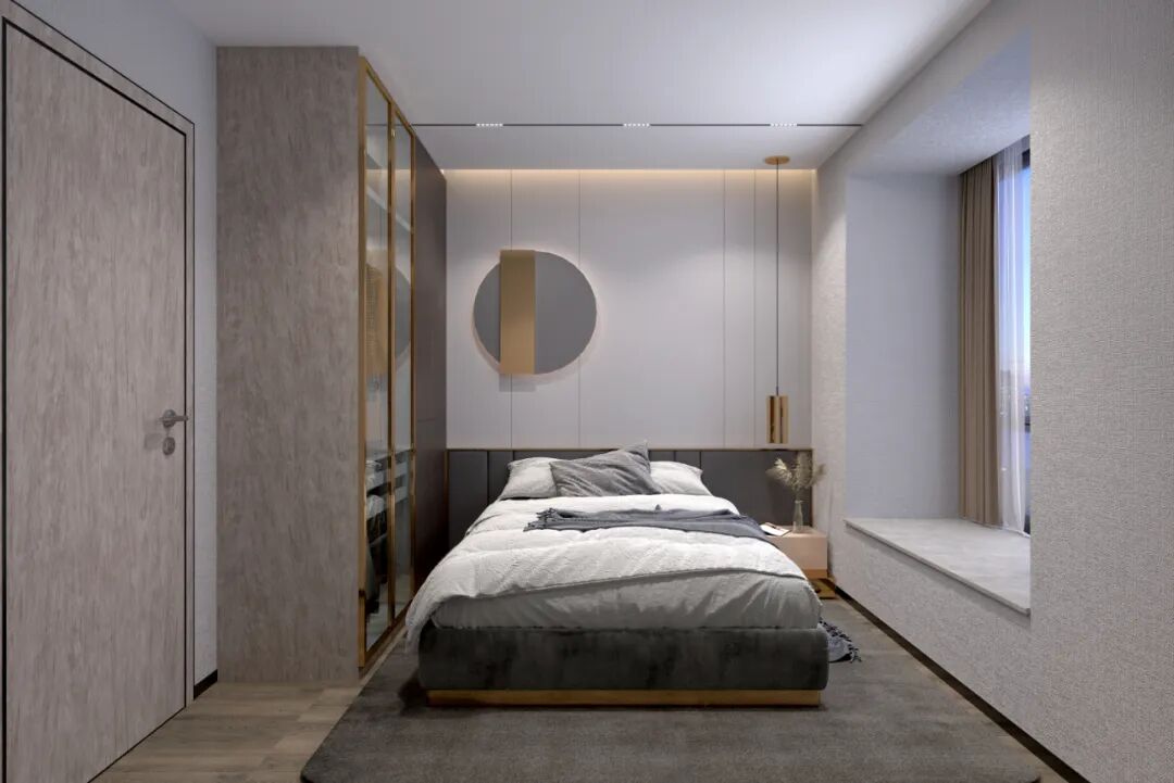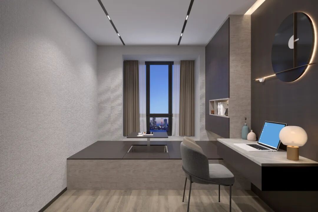 舒适的榻榻米空间在简洁的版块组合中展现更加轻奢的轻快感,富有现代主义气息的板材花色,在几何渲染下更加立体,柜体多个功能区域一体化设计,节省空间之余还不失尊贵。