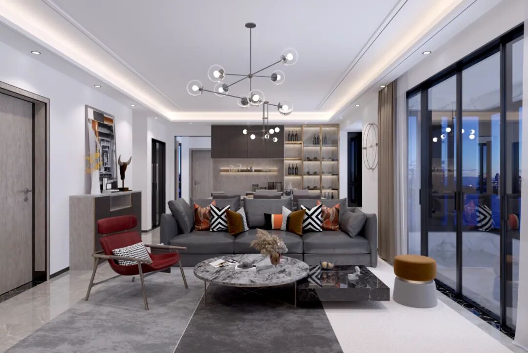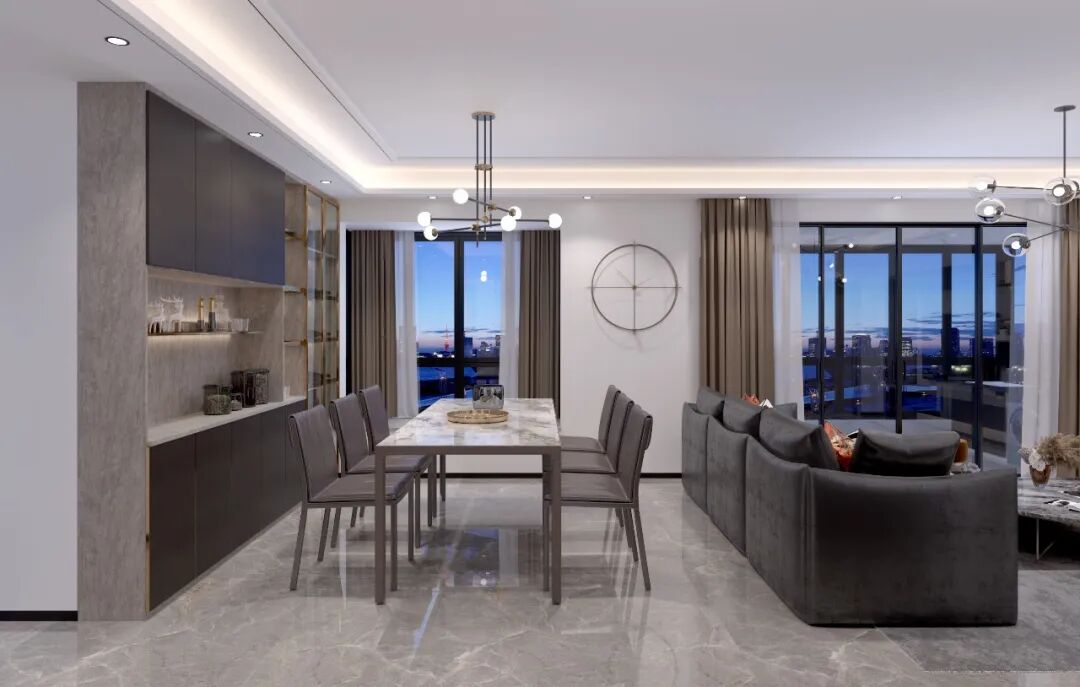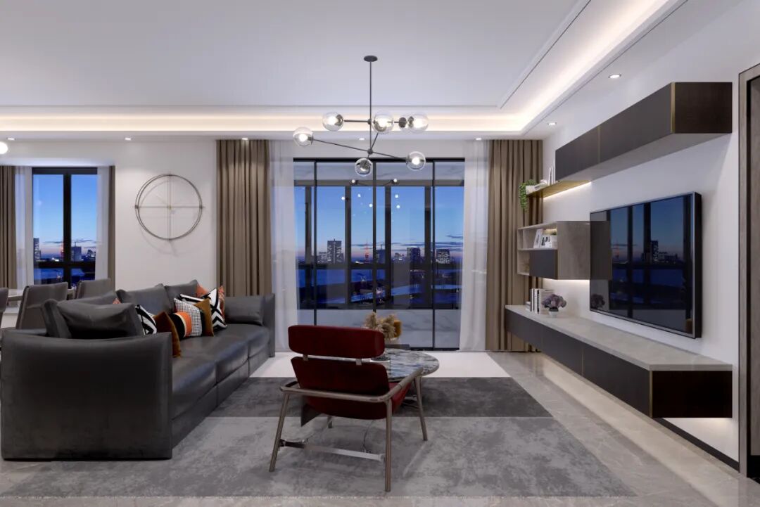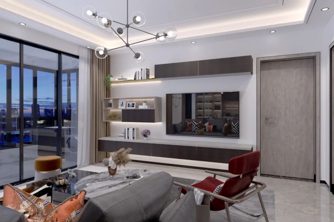 灰冷的色调丝毫不影响家居设计带来的温馨,干净利落的线条,视觉感十分强烈。电视柜采用悬柜的设计让空间设计感更强,并且还采用展示区与存储区的组合,简单又不失时尚。