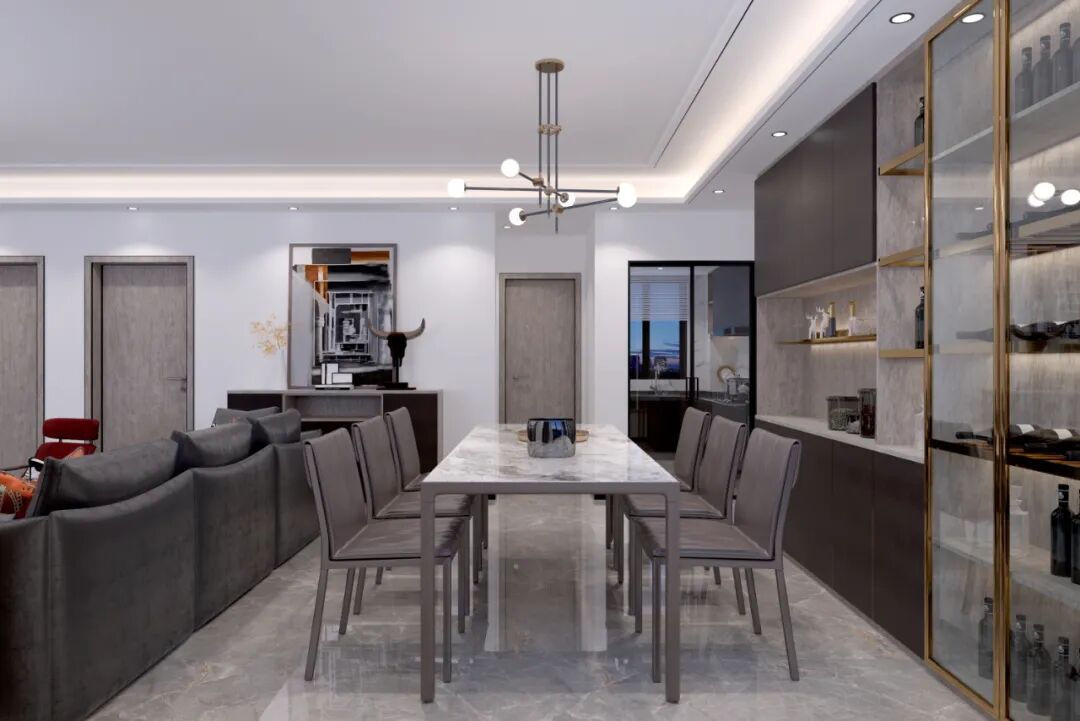 用餐厅与客厅隔而不离,餐边柜的设计特别抢眼,酒柜采用玻璃掩门设计,美酒在LED灯的照射下显得格调非常高。
