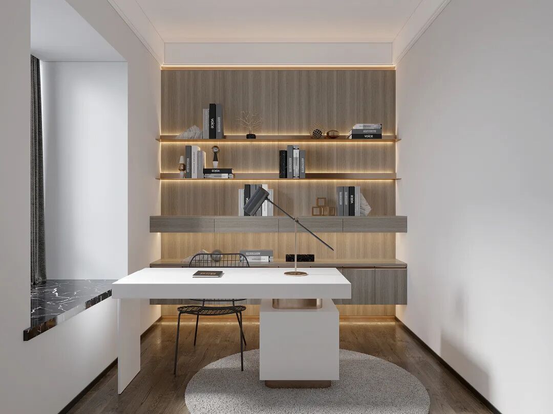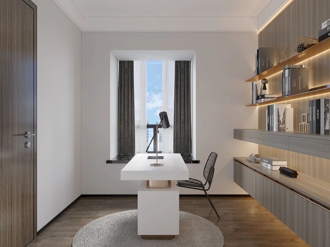 书房也十分简约,书柜采用展示的方式设计,线条干净利落,与空间浑然一体,简洁中又十分便利。
