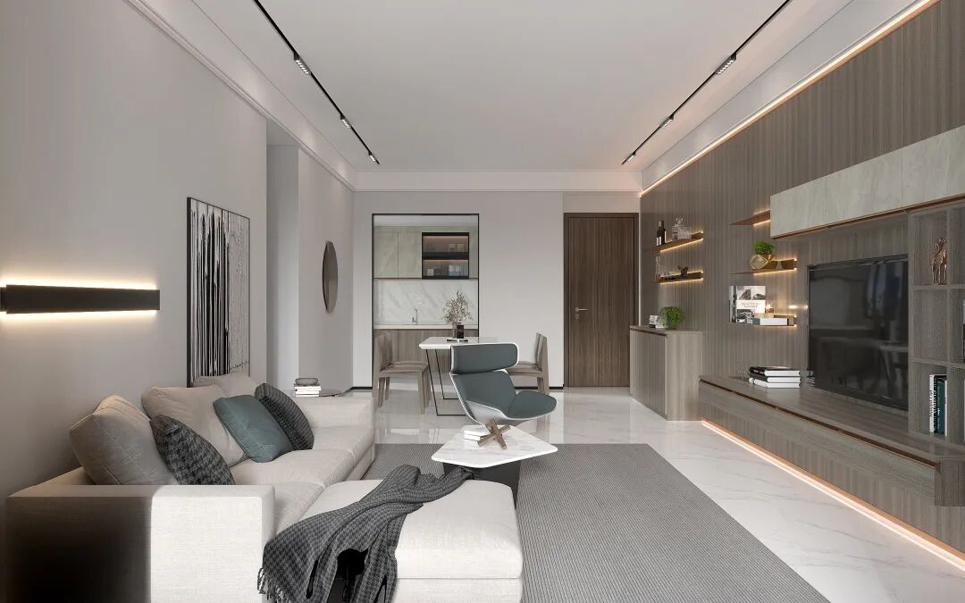 极简中又富有层次感的设计让客厅空间显得更加轻奢,简而奢,流畅的线条视觉感强烈。展示吊架在LED灯的照射下格外雅致,也为电视柜锦上添花,增加了亮点的同时也让空间显得不单调。电视柜与入户柜相连,空间统一性强。