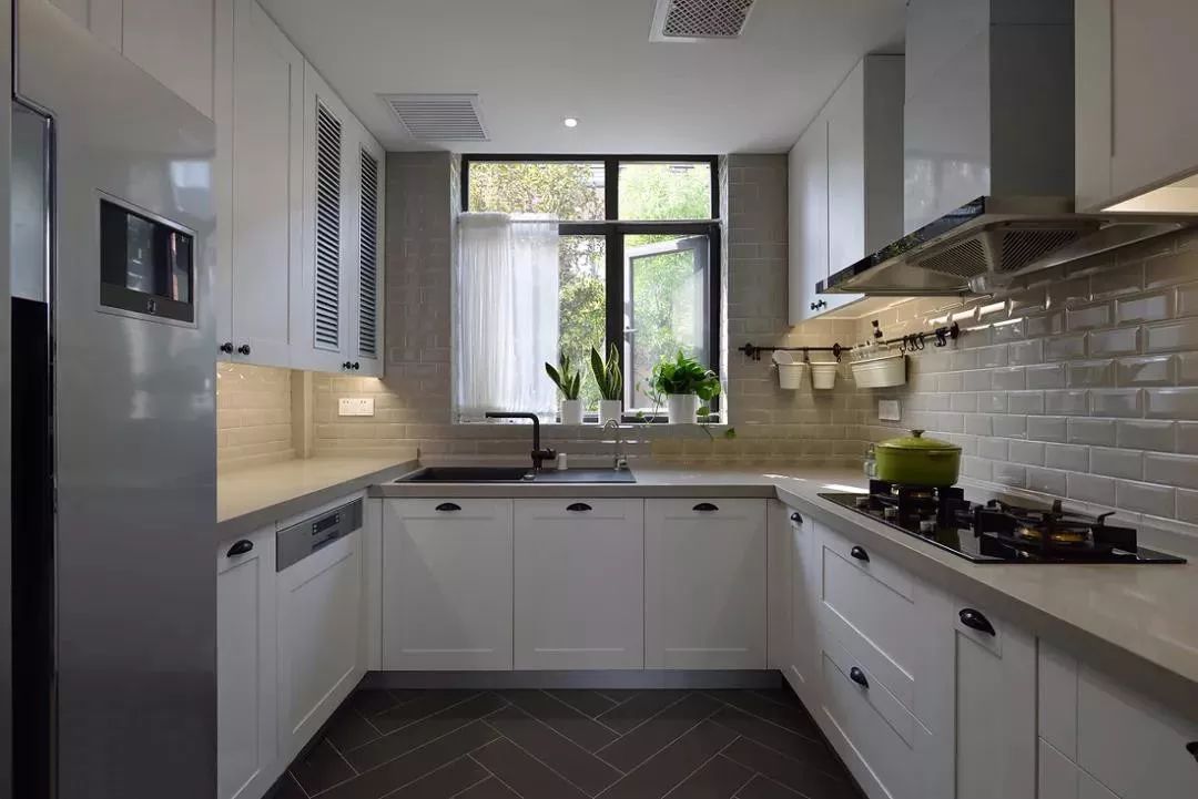 如果你家厨房户型方正,就很适合U型布局。U型布局储物功能强大,水槽设置在U型中间,符合人体工程学,在做饭的时候炒菜、切菜及常见工具都可以放在左右两侧,非常方便。