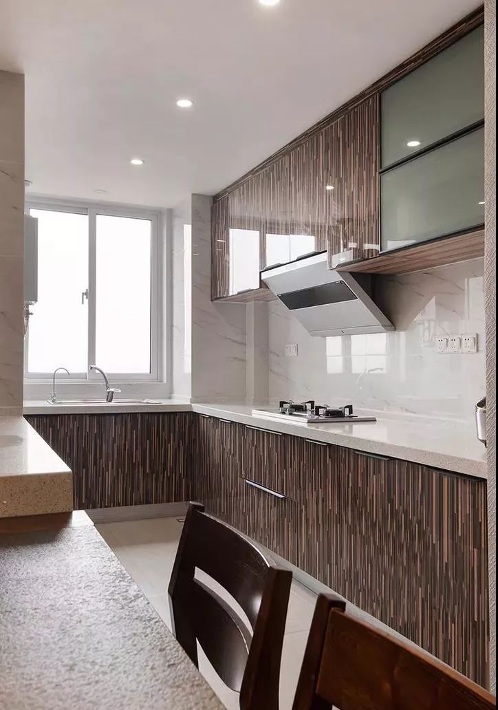 厨房里的每一寸都是值得利用的,多个转角能多出挺多的储物空间或操作台面。在一字型的基础上多了一个转角,就形成了L型的布局。把水槽和灶台放在两端,中间留空的地方作为操作台,平时洗菜-切菜-炒菜的动线布局也非常的合理。