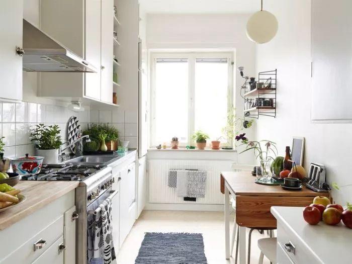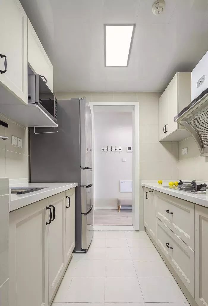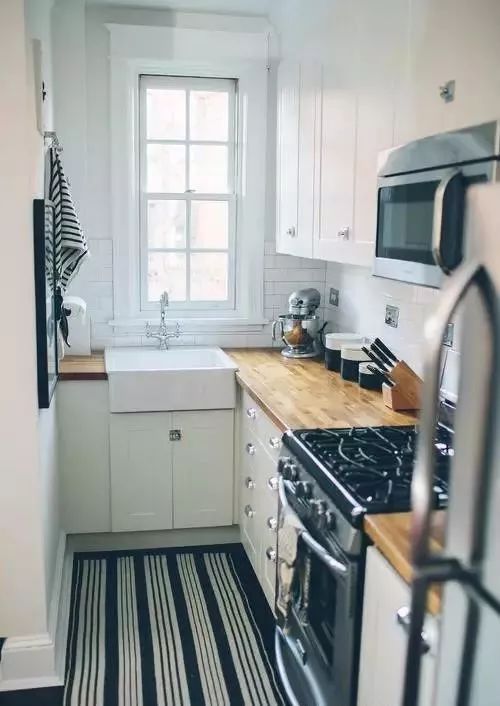 不过如果厨房实在是太小了,还是考虑减少一边的橱柜,做成双一字型或者L型吧。