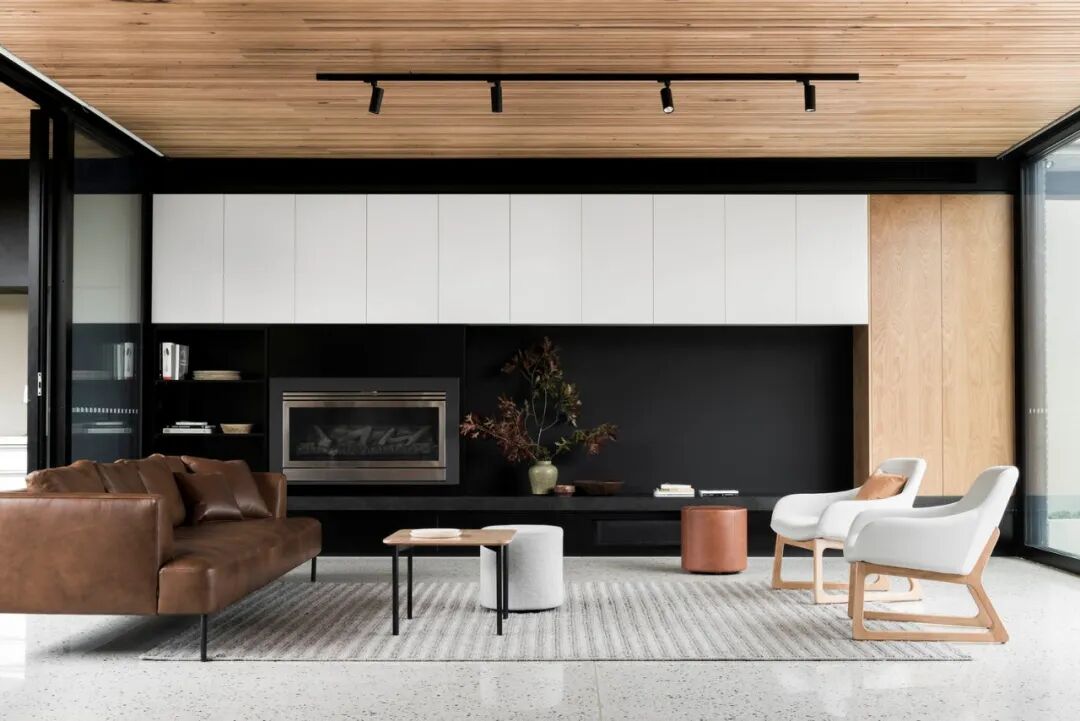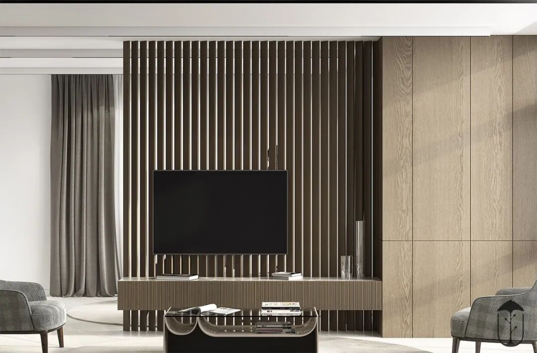 经过科学定制的极简电视墙,可以运用“隐藏式”整体定制的功能性柜体来体现——即便其内大有乾坤,可以科学的满足生活当中一切的收纳需求,但其外部依然浑然一体、简练一致。