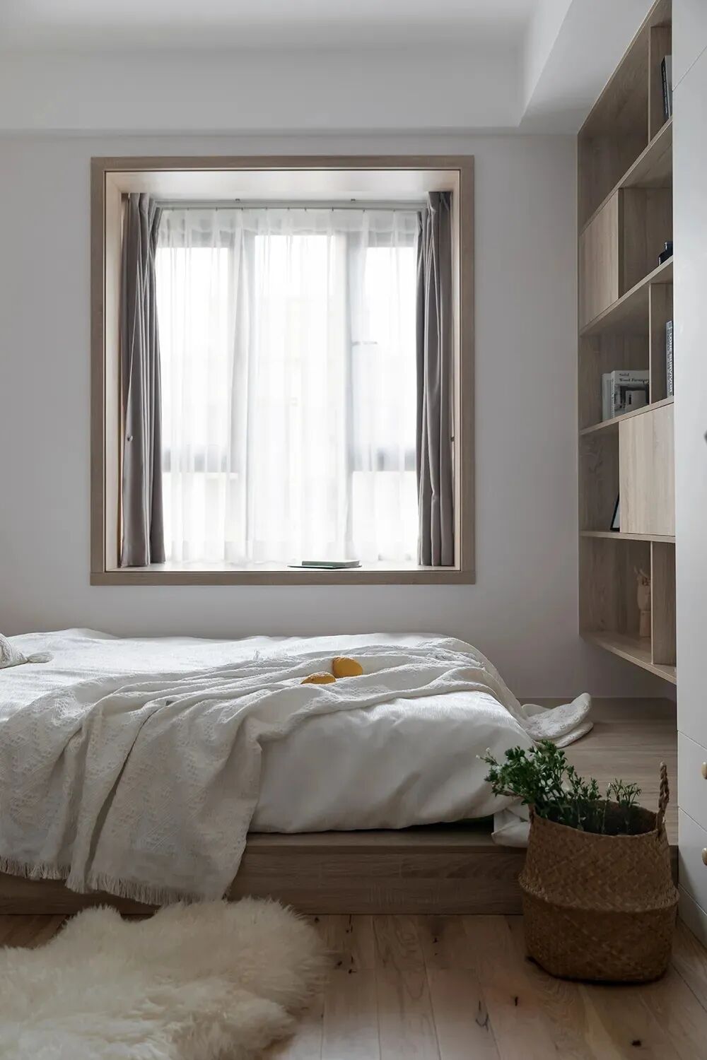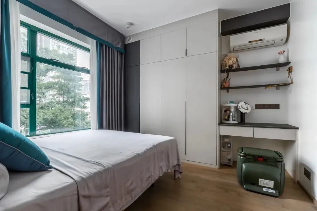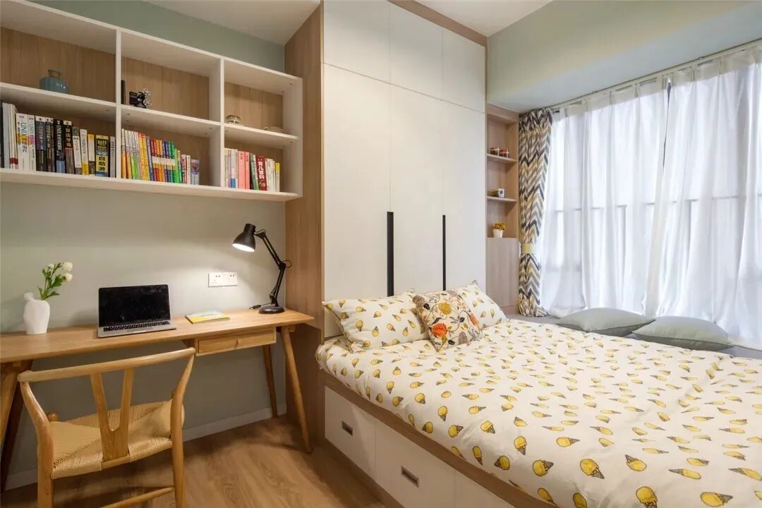 靠窗位置做悬空书桌,侧边则是收纳架,也是非常的实用大方。
