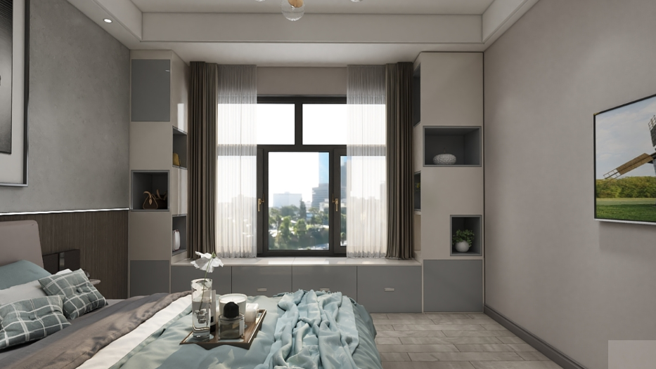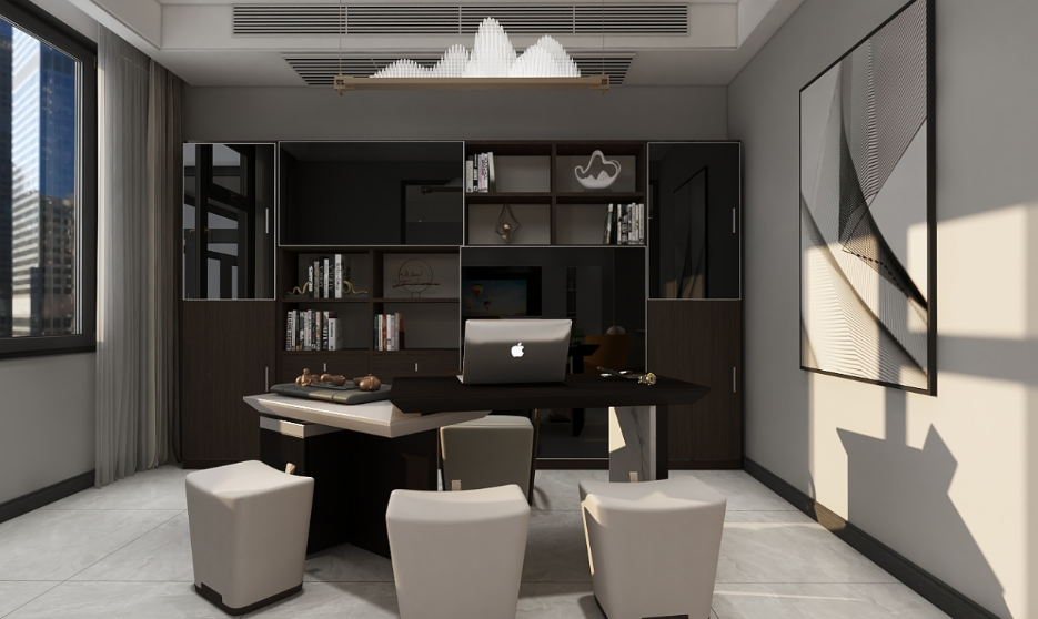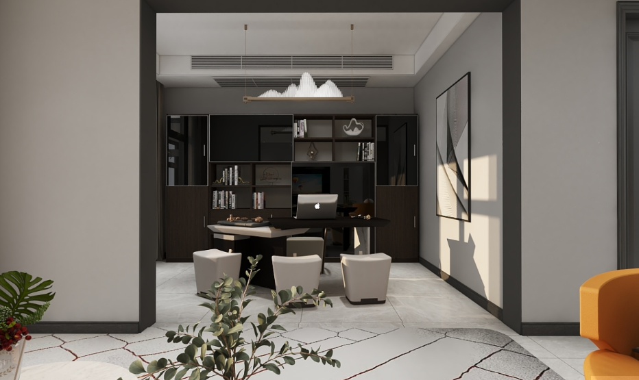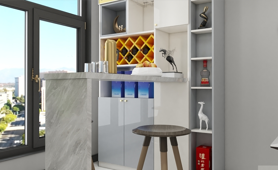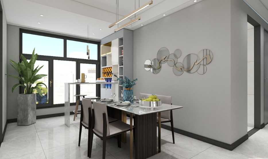 男业主广交博友,因此将书房做敞开式,客厅与书房二者相互贯通融合,一方面可以使客厅更加开敞,另一方面,又能使客厅更具书香气息,书房则兼具会客书房功能,一举两得。餐厅区域将原有阳台与餐厅打通,在原有阳台门位置设计吧台,使生活方式更加多样化,更具生活情调,配合北阳台全景落地窗,户外美景尽收眼底。