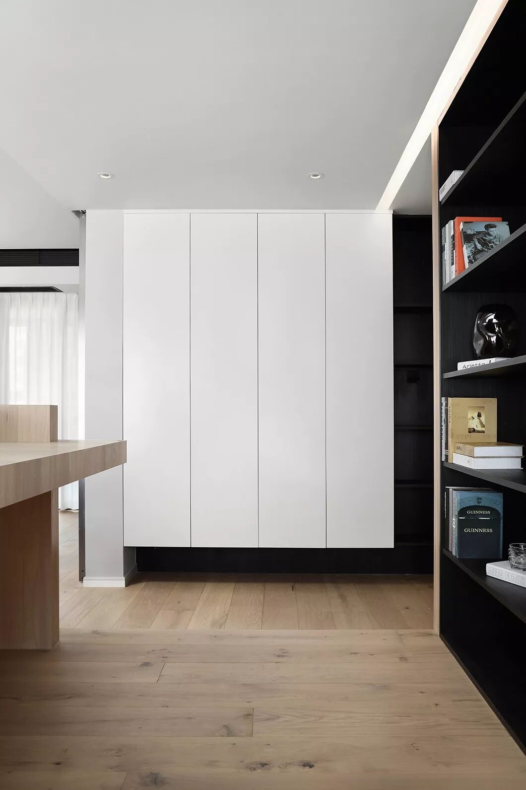 进门右手边是鞋柜,鞋柜下方是悬空的,方便放常穿的鞋子,整墙到顶的鞋柜可以满足屋主买鞋的欲望。左手边做了抬高处理设定为一个多功能书房,抬高的地台也可作为平时换鞋的鞋凳。设计师让木工师傅将入户大门也贴上了与屋内一样材质的原木色饰面,巧妙的将入户隐藏在木盒中。