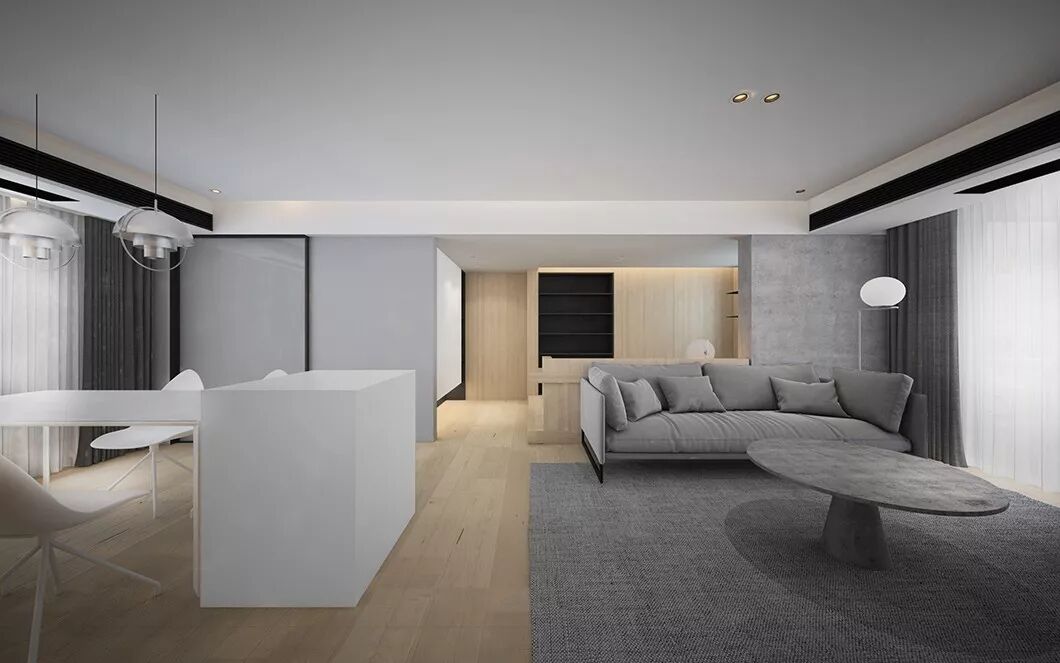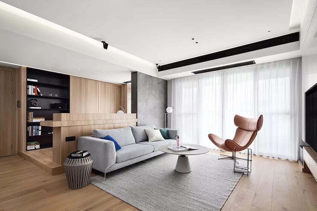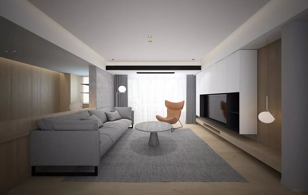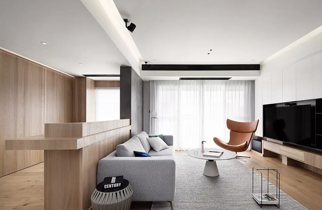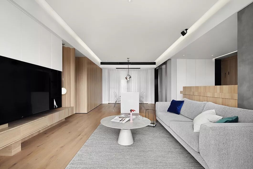 原木色与白色哑光烤漆面板做的造型电视柜,灰色沙发设计虽简洁却不简单,营造出一种独特的空间感,折射出主人的高端生活品质。整个公共区开阔通透,让人感到闲适无压的生活节奏,活动的空间大了心情自然而然也就轻松起来。