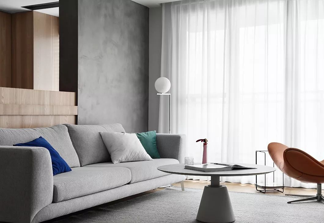 客厅与书房空间灵活联动,既保持了对话,又相互独立,动静结合赋予空间一种灵动性。圆形茶几不会占用太多的空间,烤漆材质与对面的电视柜一样,使得整个空间简洁,黄色皮质躺椅的使用,让水泥墙与沙发形成的低明度冷色系的空间有了温度,搭配地毯,带来归家的温馨感。