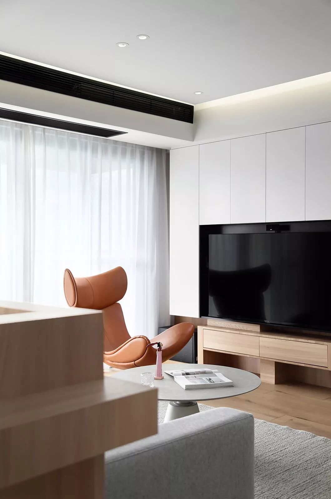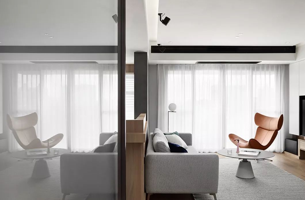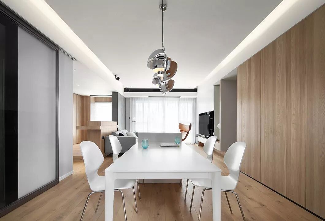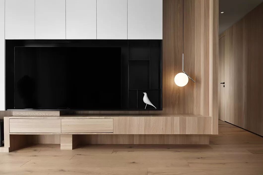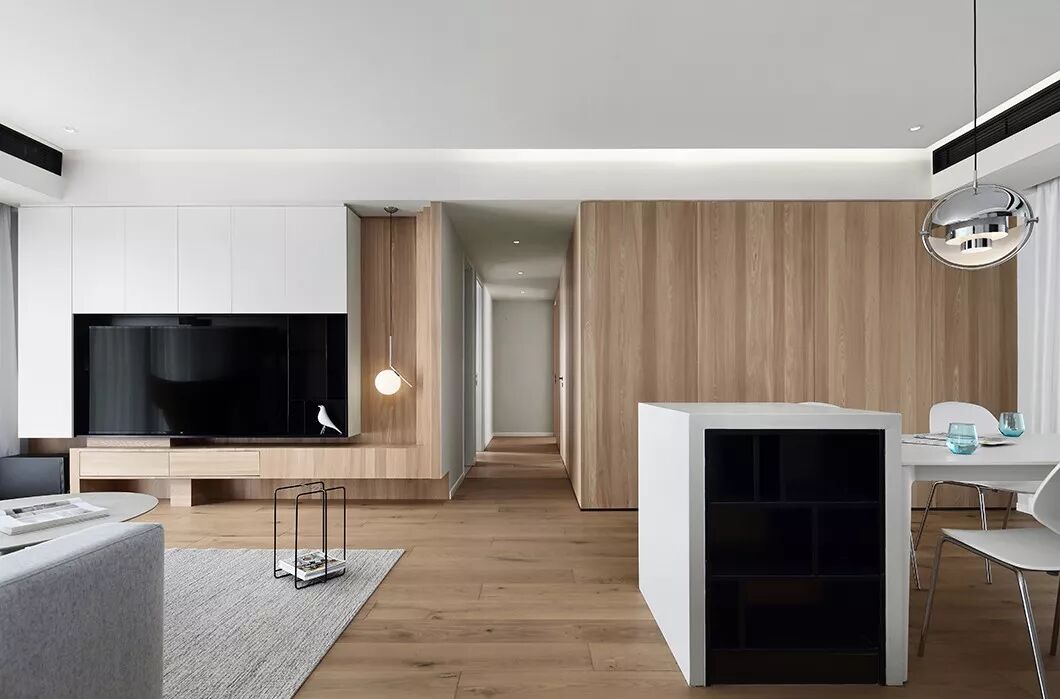 设计师选用白色烤漆面板做柜门,使空间明亮简单,加上大块面的原木色饰面板与整屋木地板,让明亮的空间显得更有暖意,仿佛置身在森林中自在、随兴。