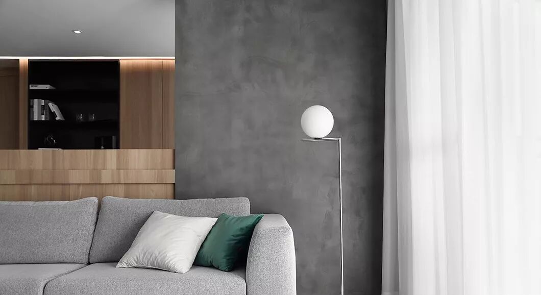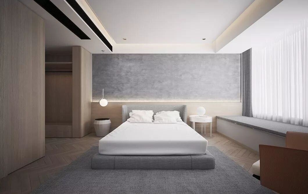 主卧也延续了水泥墙面+原木设计,依然是屋主喜欢的风格,用灰白进行调和,不偏离整体设计方向。