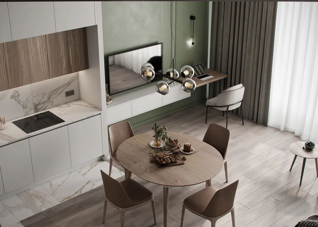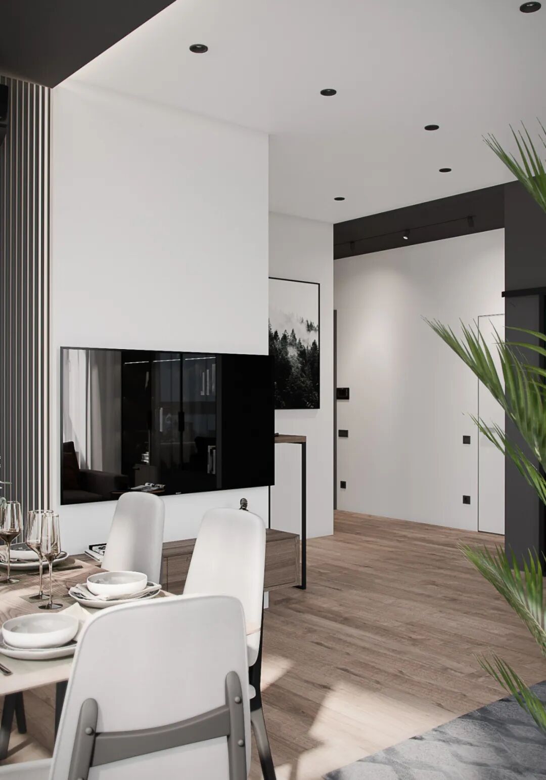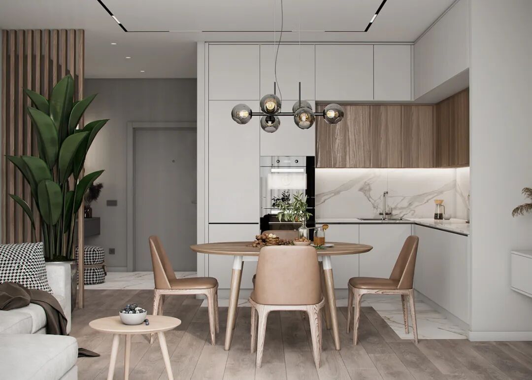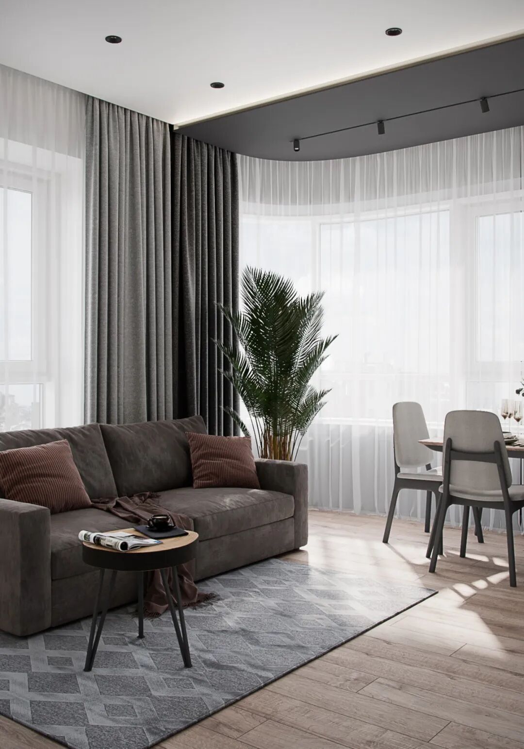 72㎡三居室公寓的设计项目,整个空间以现代简约风格为基础,采用时尚的灰色、象牙色结合简洁大方的空间,营造出一个舒适自然的空间感。4人的饭桌带软椅,