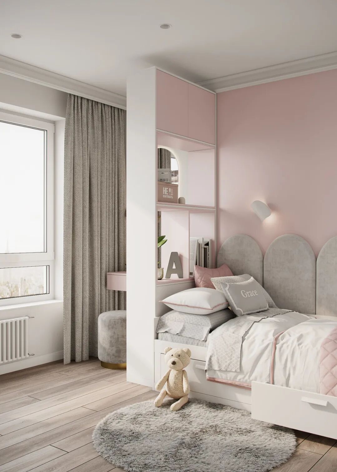 卧室配有一张带软床头板的双人床,一张婴儿床和床头柜。地板,