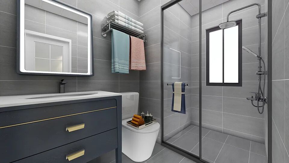 ▼ 客卫整体灰色的基调,搭配充满深蓝色的浴室柜,提升了整个空间的质感,巧妙的干湿分离设计略显大气,使用起来方便舒适