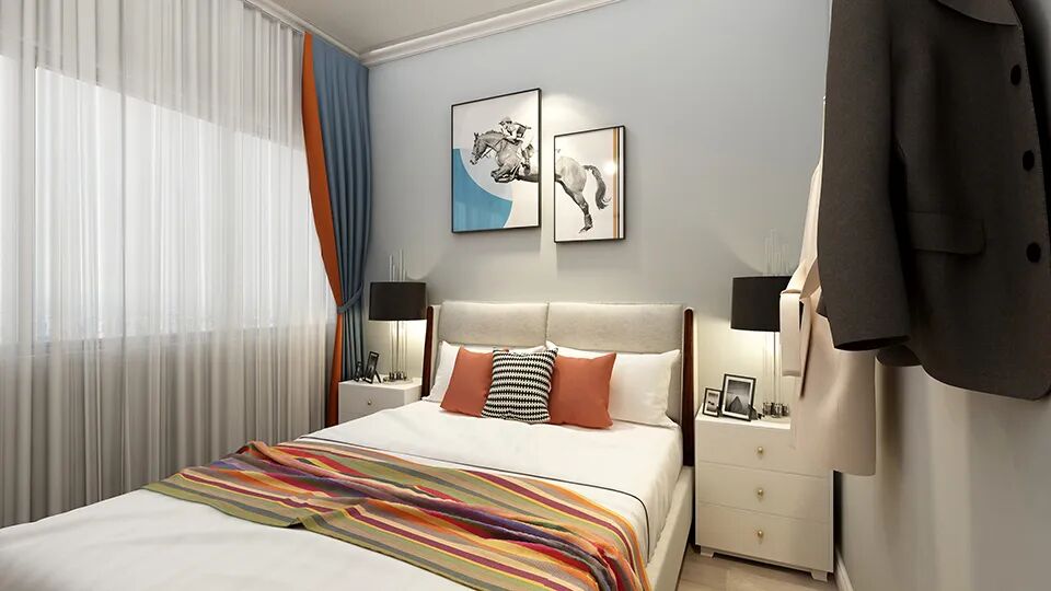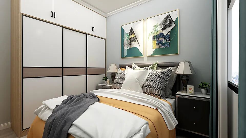 ▼ 主卧阳光透过纱帘洒进卧室,散发着温馨自然的味道。整面墙的白色定制衣柜,加以绿色装饰画点缀,增加了空间层次感