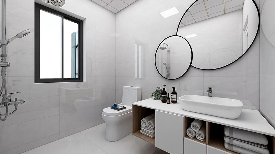 ▼ 主卫整体以白色做主色,定制浴室柜搭配圆形的大小镜面,不仅给空间注入了时尚安静的气息,也保证了它们的实用性