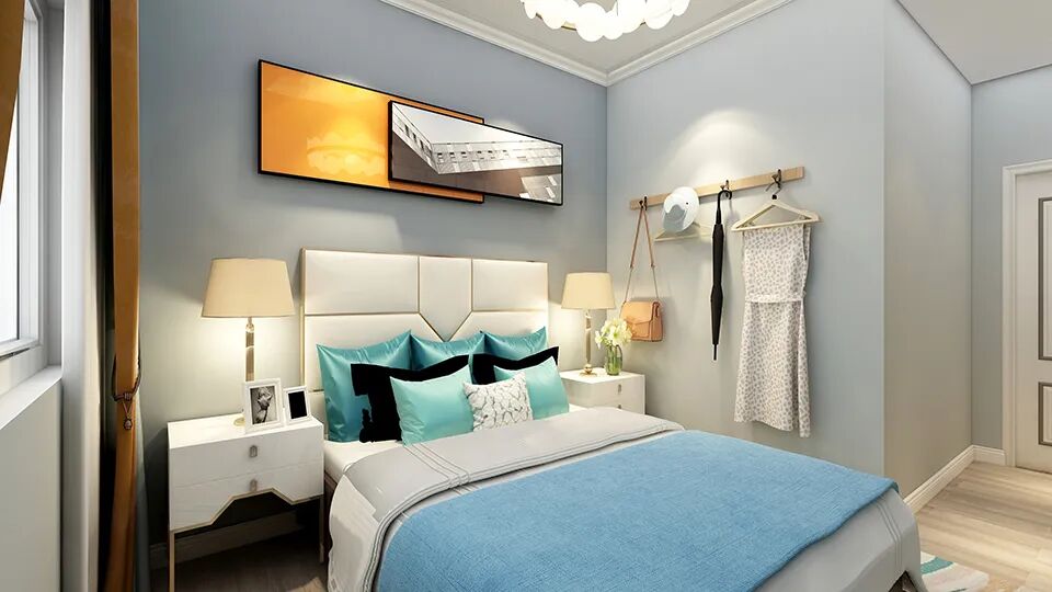 ▼ 次卧天蓝的床品与灰蓝色的墙面为空间营造出一种宁静的氛围,居室内也没有多余的其他家具,整体显得简洁大方