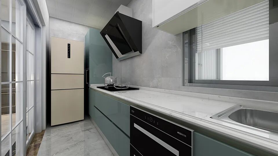 ▼ 一字型厨房设计将空间完美利用,整体以墨绿搭配白色为主,加上大理石材质的操作台面,深浅的合理搭配为空间增分