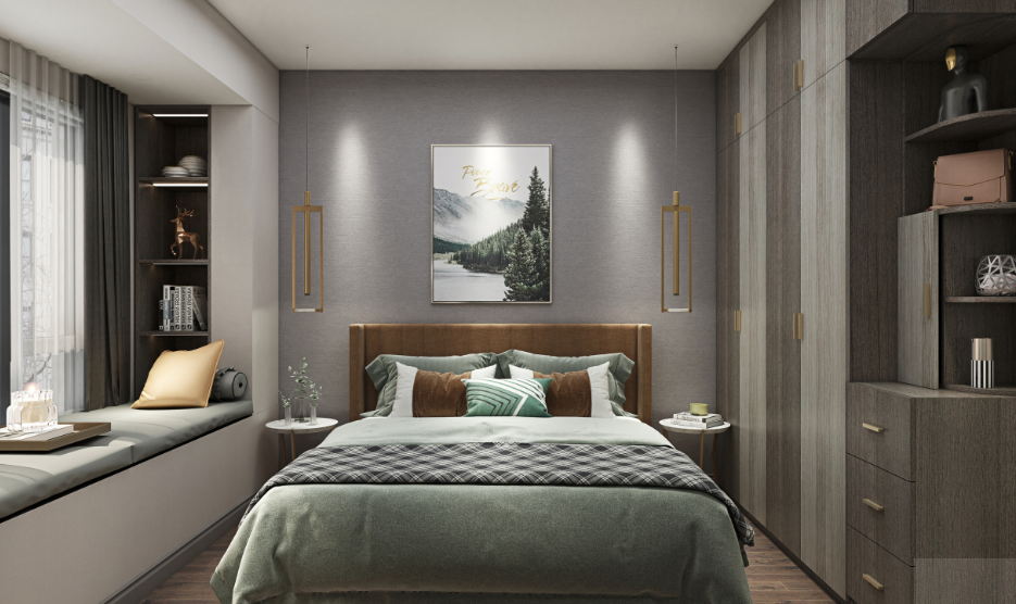 主卧没有做过多的色彩,家具的搭配也力求简洁,地面铺贴的是便于打理的强化地板,黑色皮质床头,宁静中舒享品质,希望业主在忙碌了一天后能好好休息。