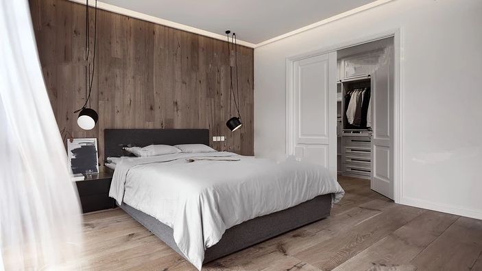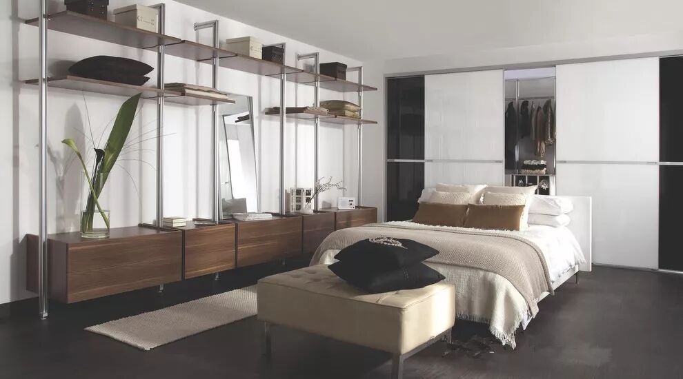 避免选择百叶门之类容易进尘的衣柜门,现在衣柜选择多样,可以根据室内风格搭配不同的柜门,也能制造出其不意的视觉焦点。另外,选择推拉门还可以减少开门带来的阻碍。