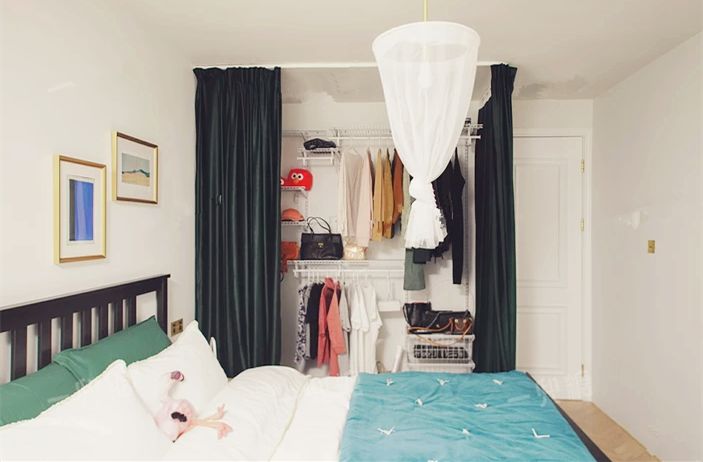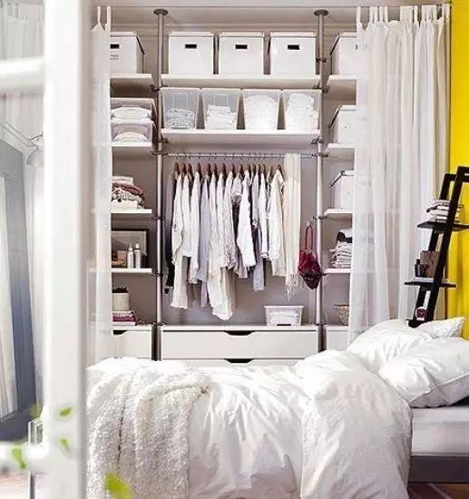 1.开放式衣柜最大的问题就是灰尘,可以在在柜顶/天花板上钉个轨道,加个布帘/纱帘,阻挡灰尘。