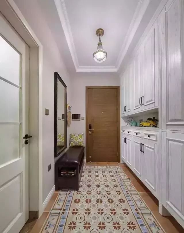 如果家里面的鞋子量很大的话,建议设计鞋柜应该首先考虑容量,那种顶天立地的大面积鞋柜比较适合。像下面这种:鞋凳、镜子、衣帽钩这些都选择房子鞋柜的对面。