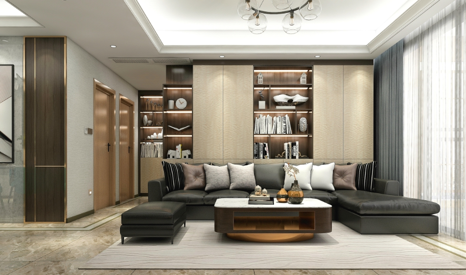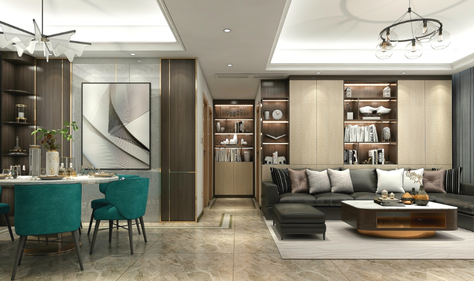 方方正正的户型,平面布局很合理过道流畅,没有磕磕碰碰的地方。护墙 板跟定制家居的结合设计,整面墙体整洁统一,吊柜虚实结合,错落有 致,能够随手取放自己想要的物品,也可以收纳珍贵的东西。整体墙面的 点缀,让空间没那么沉闷。