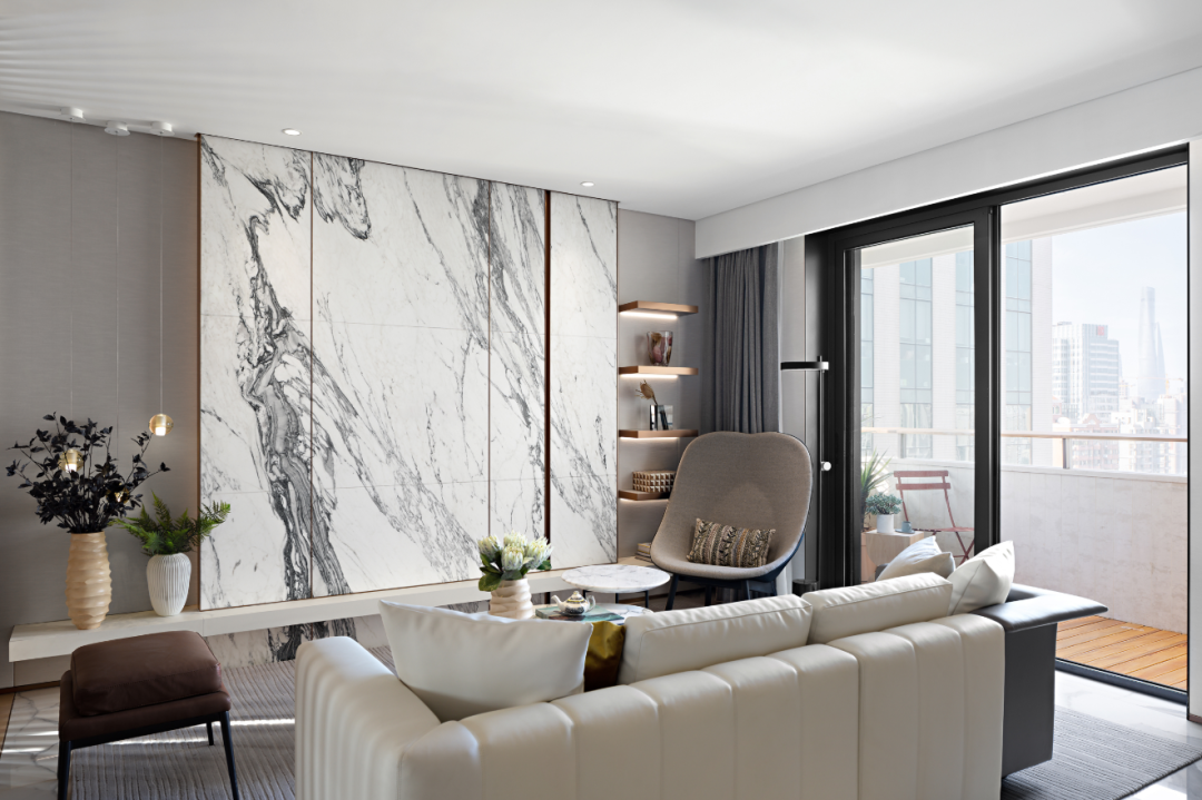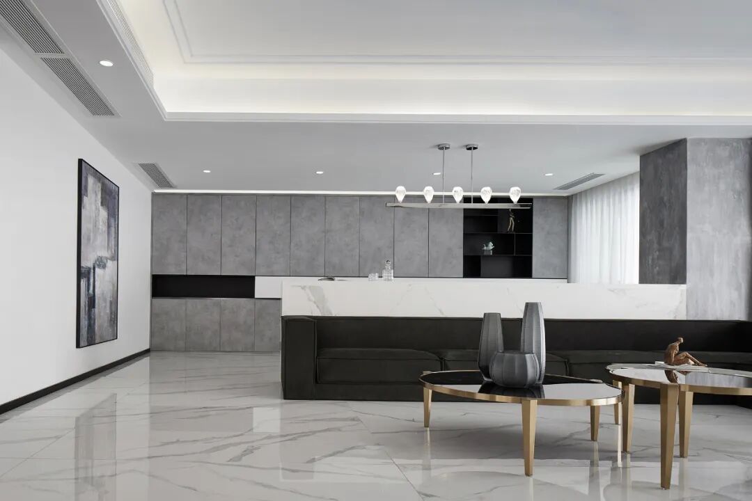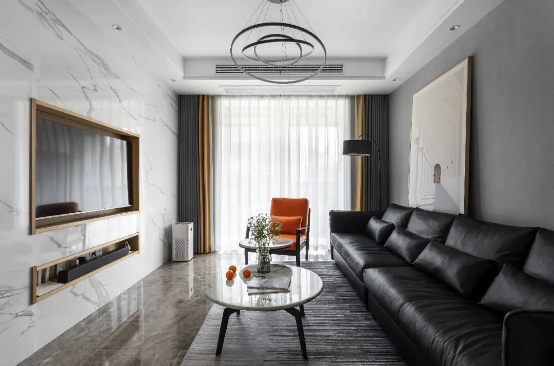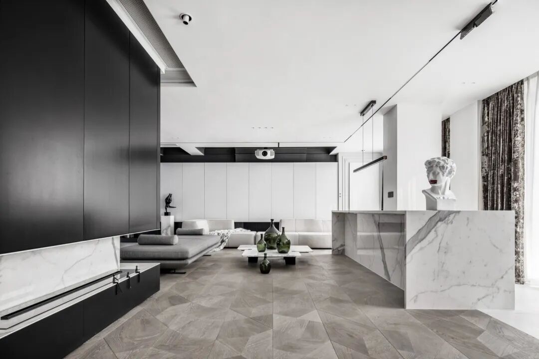 说实话,黑白灰的配色很百搭,但也很常见,很多风格都可以这样用;要想体现轻奢风的黑白灰,需从材质上下手。