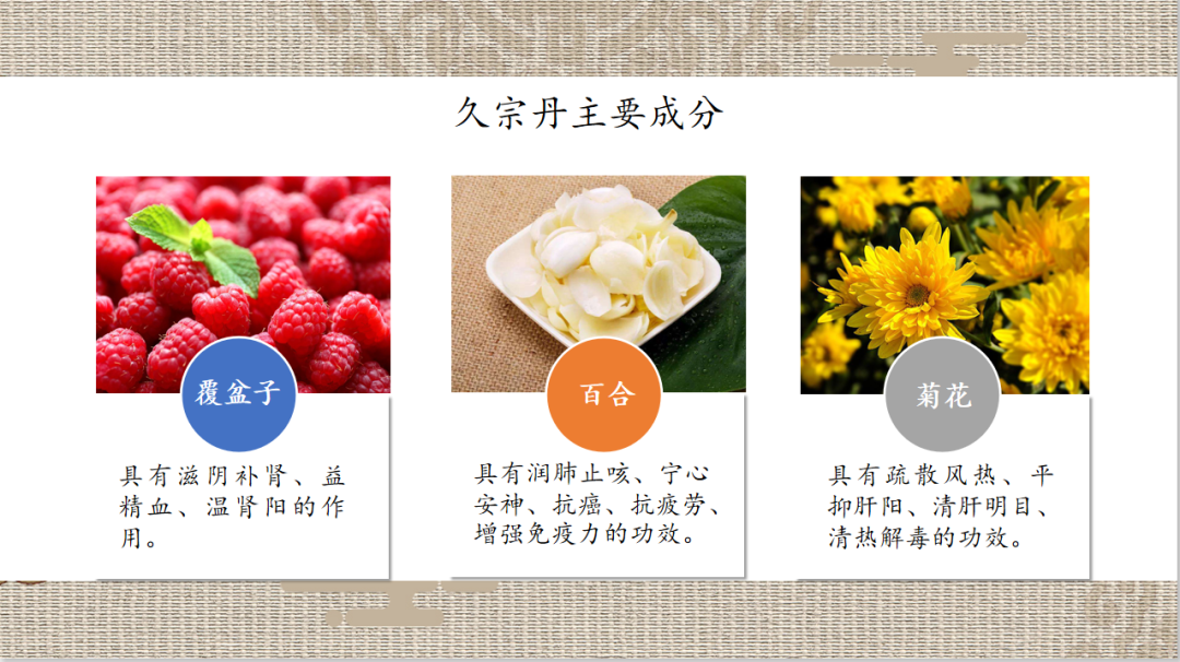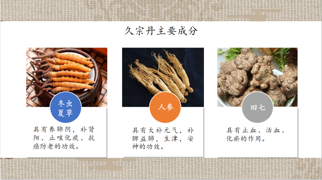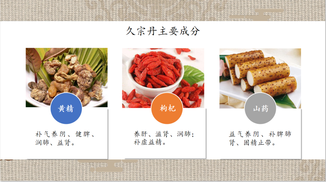 久宗丹由十八味名贵中草药高科技提纯而成,其主要成分有人参、冬虫夏草、牡蛎肽、田七、黄精、灵芝、覆盆子、山药、枸杞、薏仁、葛根素、桑葚花青素、益智仁、百合、菊花、大枣等18位中草药(不含糖,不含任何添加剂,不含激素类违禁成分)