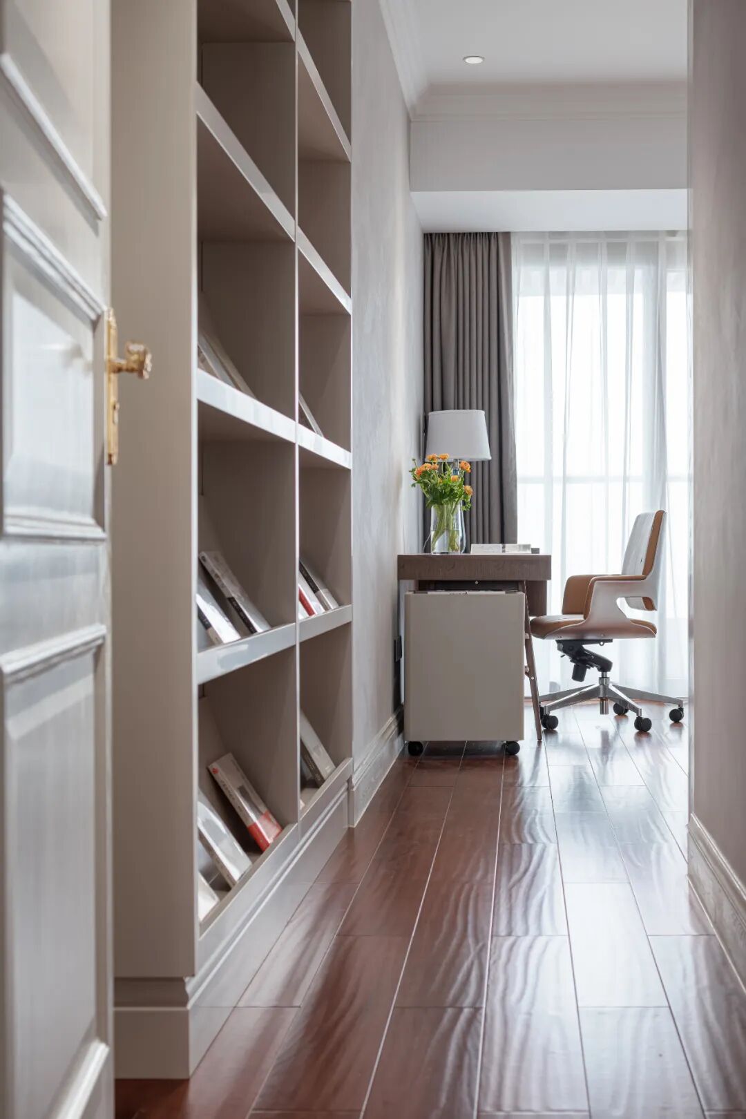 客厅线条优雅的水晶灯,以轻盈的姿态预告了夜晚的浪漫情调。对称而列的储物架充当书海里的配角,席地而坐翻弄书页也是一幅静美温柔的画面。