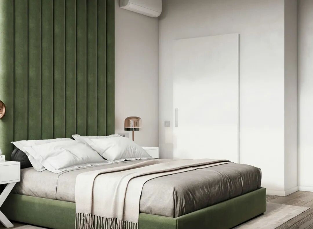 次卧色彩以灰色+绿色,设计以实用为主,没有过多的装饰。