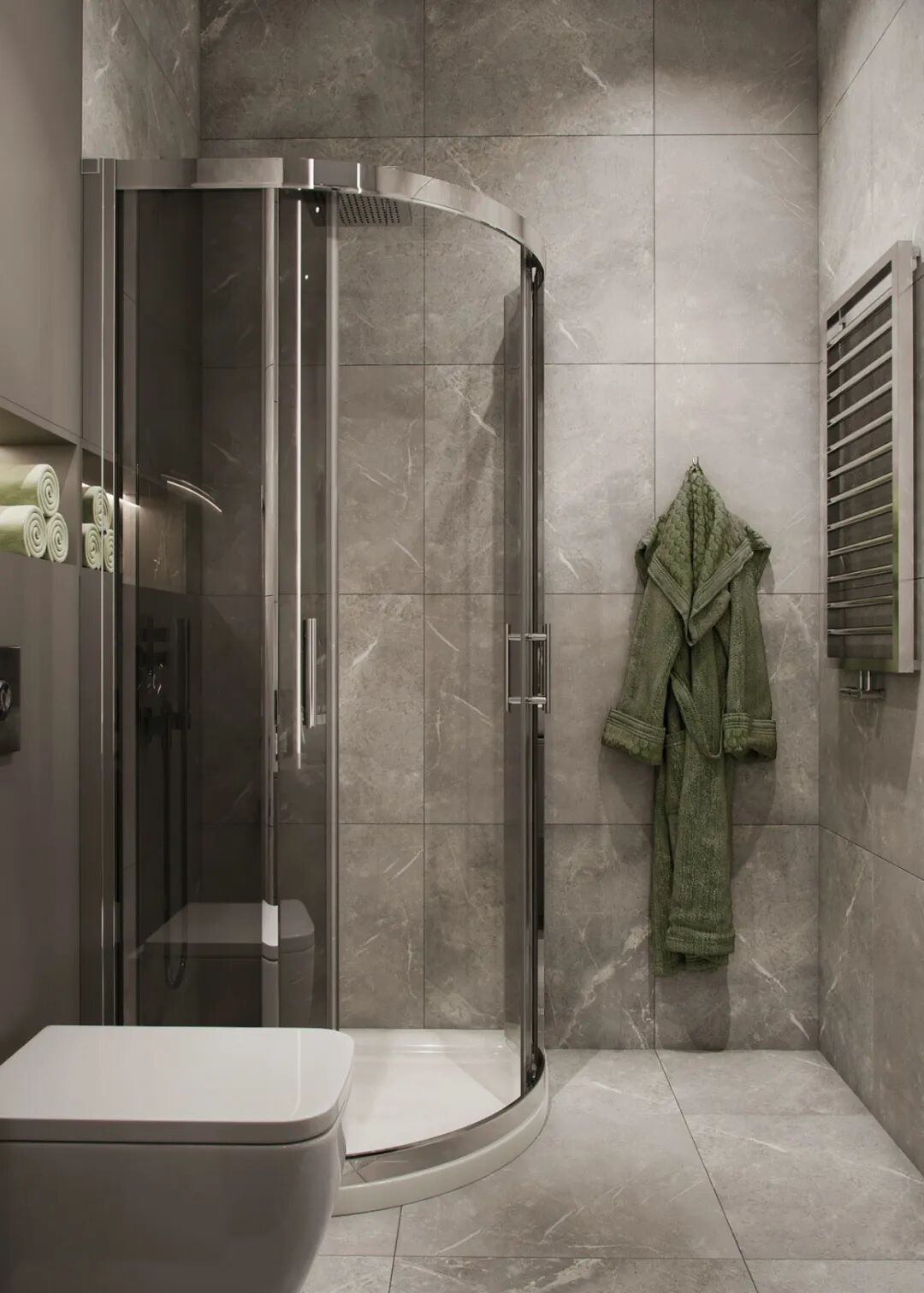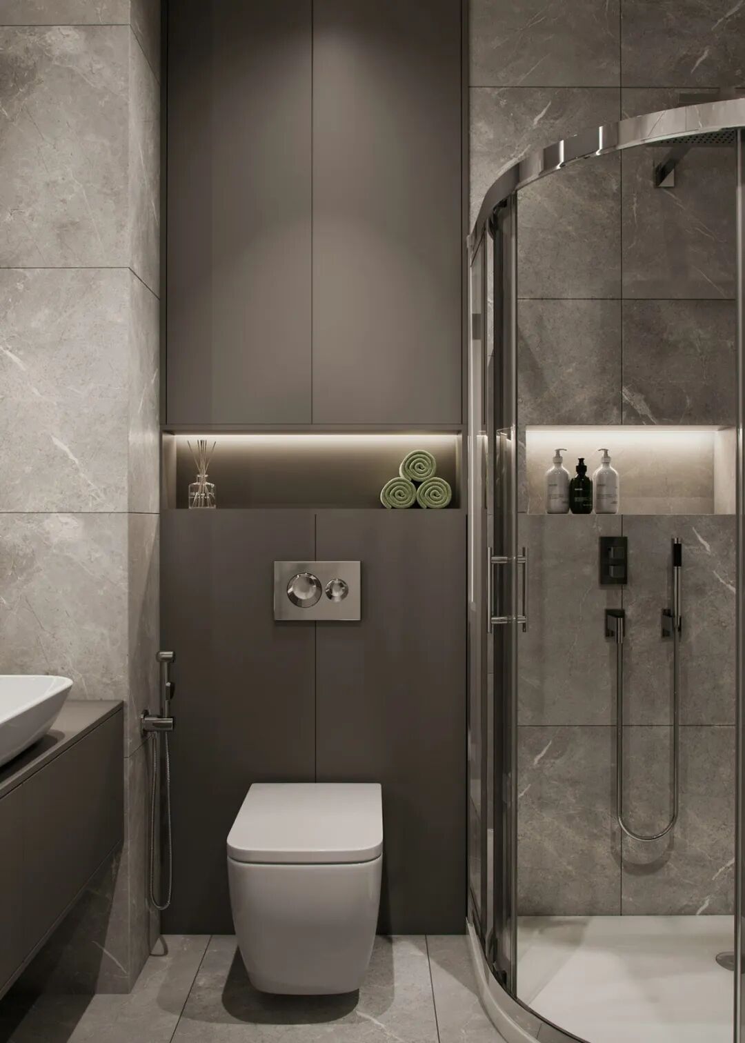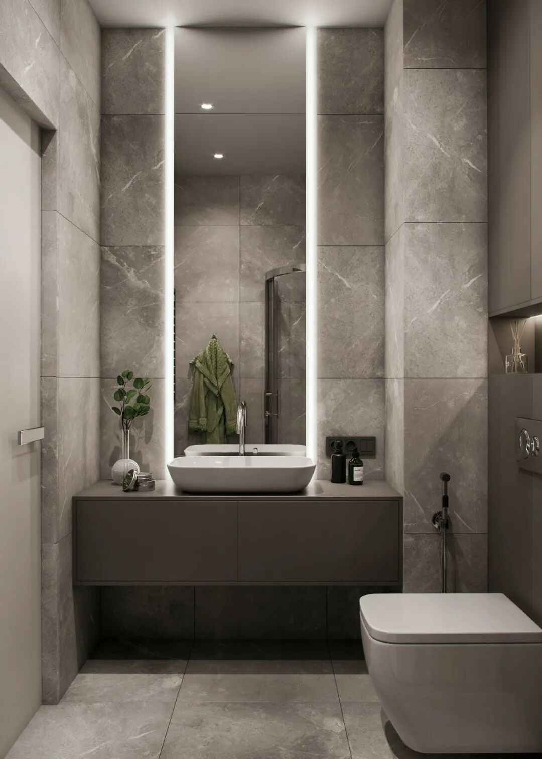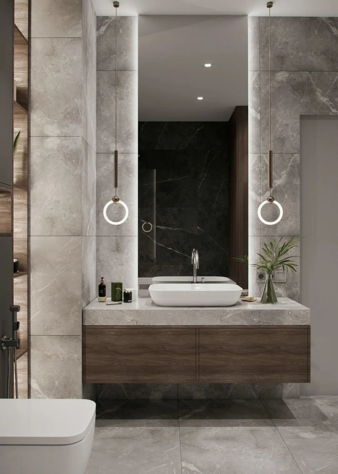 主卫灰色大理石+原木色搭配,洗漱柜悬空而置,结合大面积的镜柜,满足收纳功能的同时,也起到了一定的视觉延伸效果。