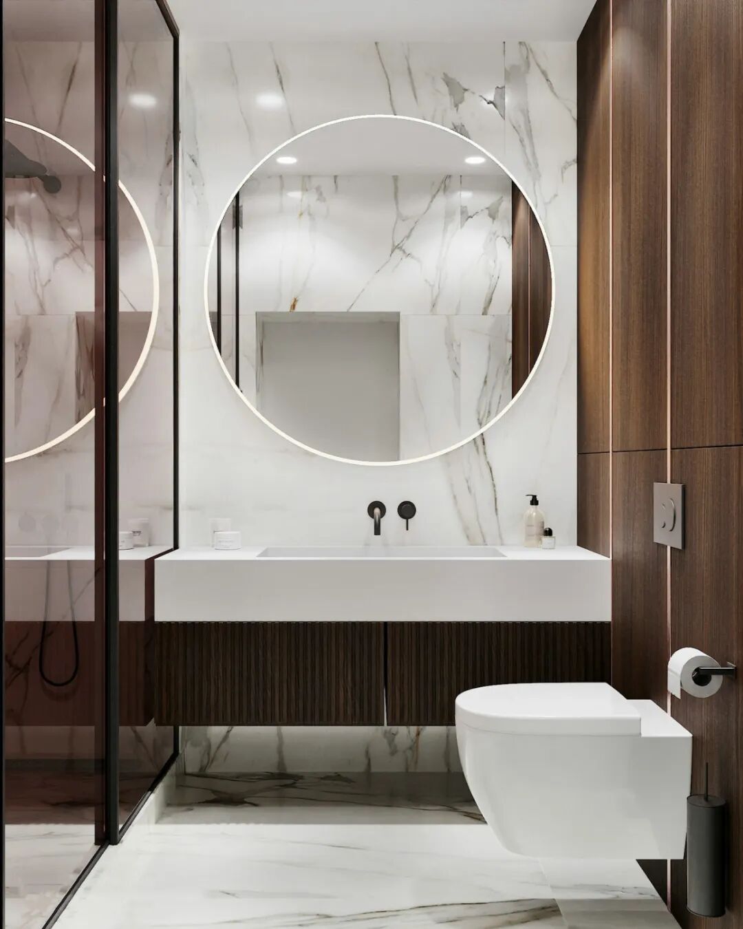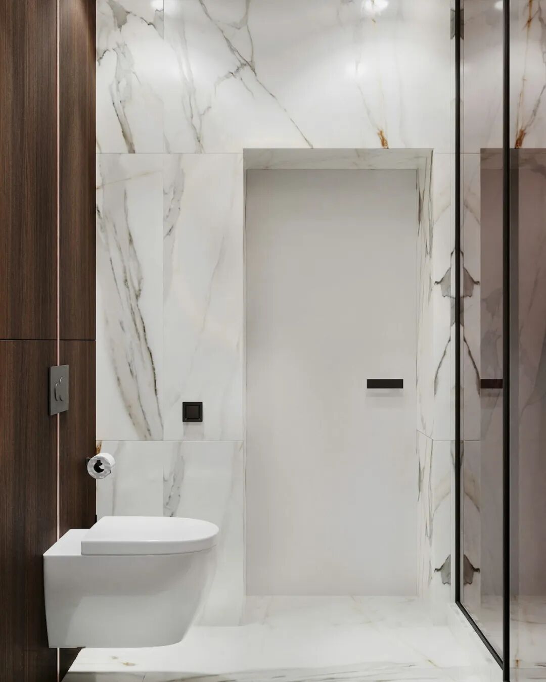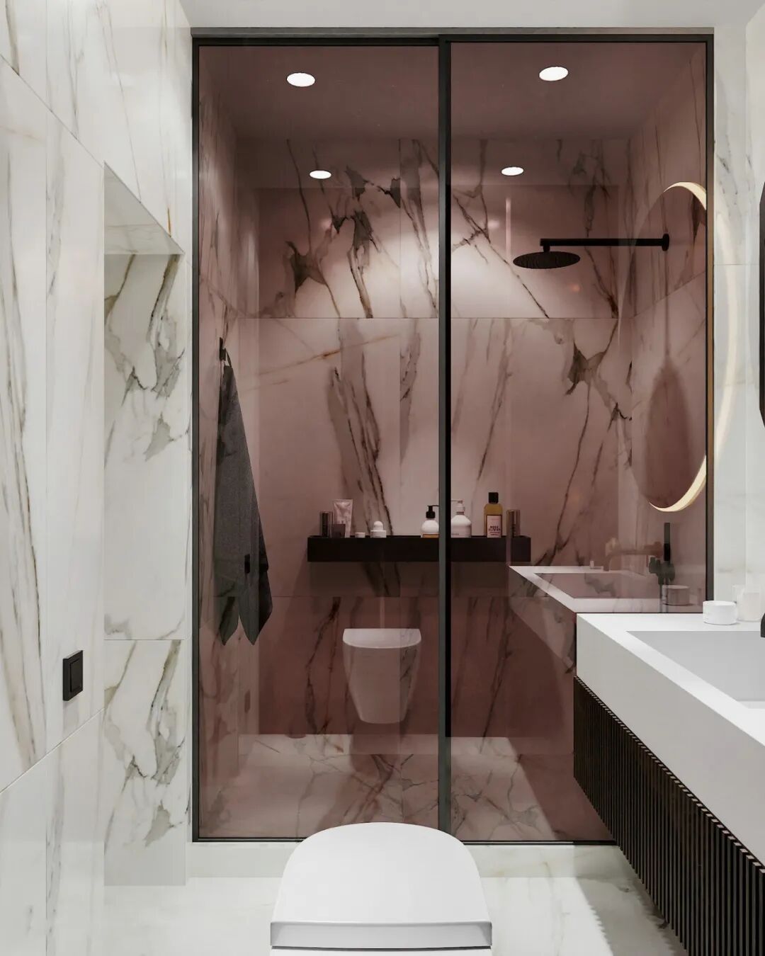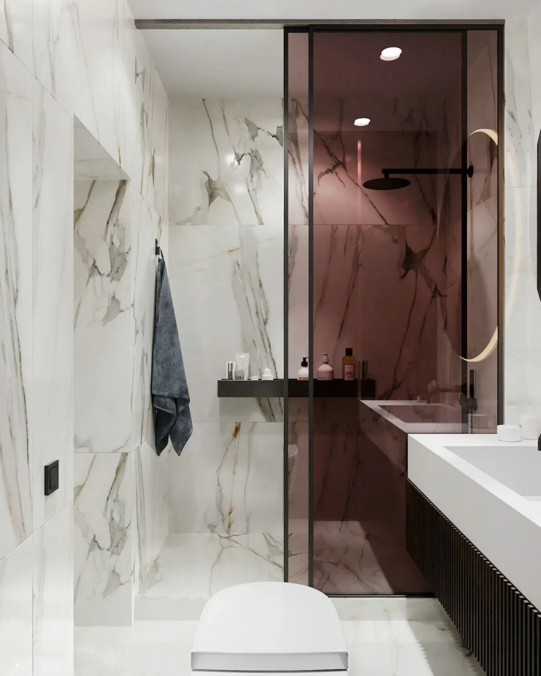 卫生间则没有延续空间的主色调,而是选用白色作为主色调,暗红色的玻璃门不仅做到了干湿分离也为空间增加了一抹色彩,使空间更加质感,复古。