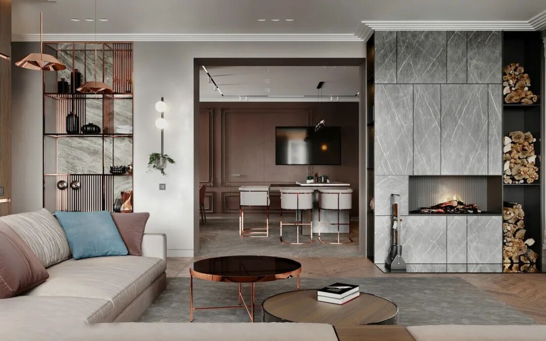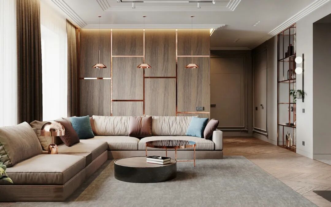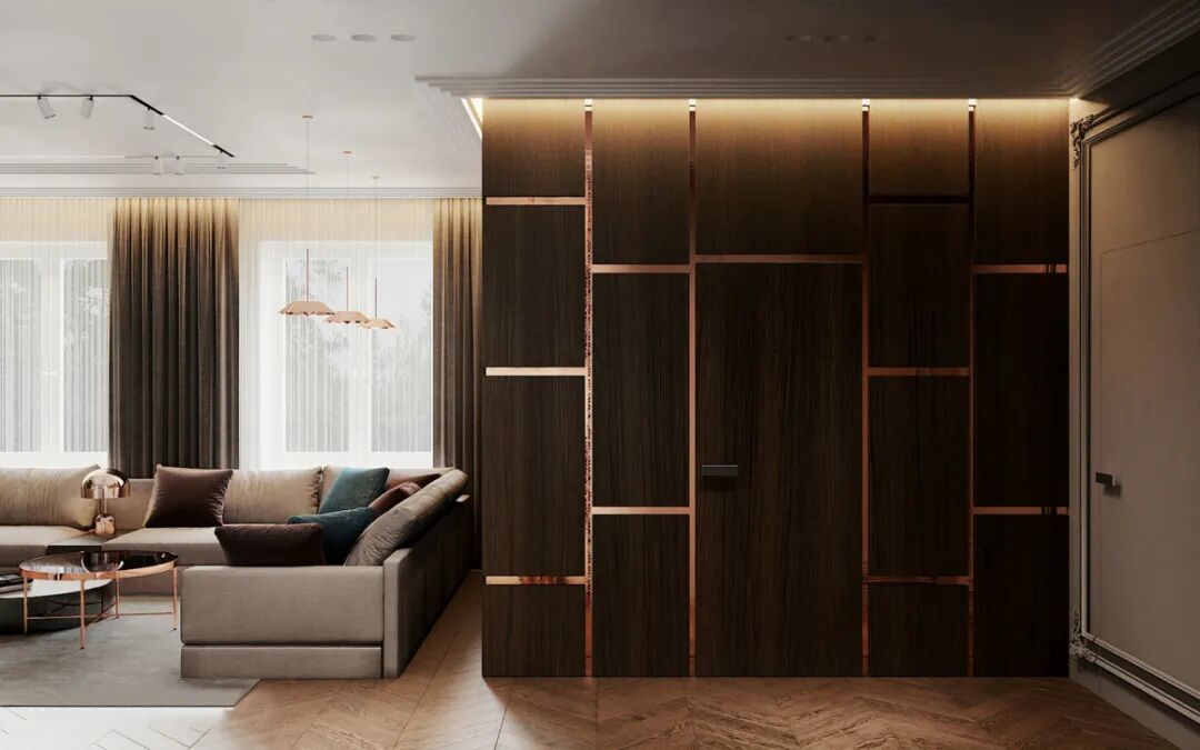 柔和浅色调搭配天然木皮,加入绿植的设计,能为日常注入一股自然放松气息。沙发背景墙在原有的木质面上增加了金属条纹,使空间更加有质感,给人眼前一亮。