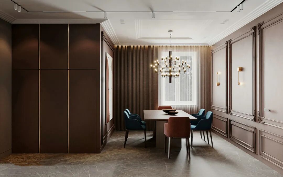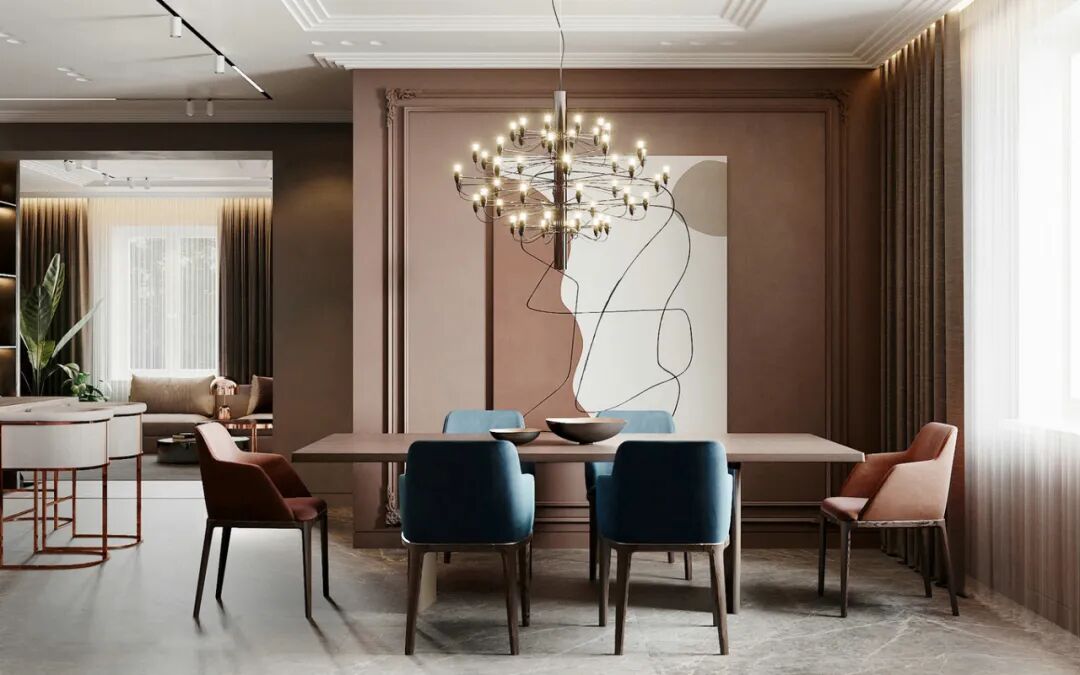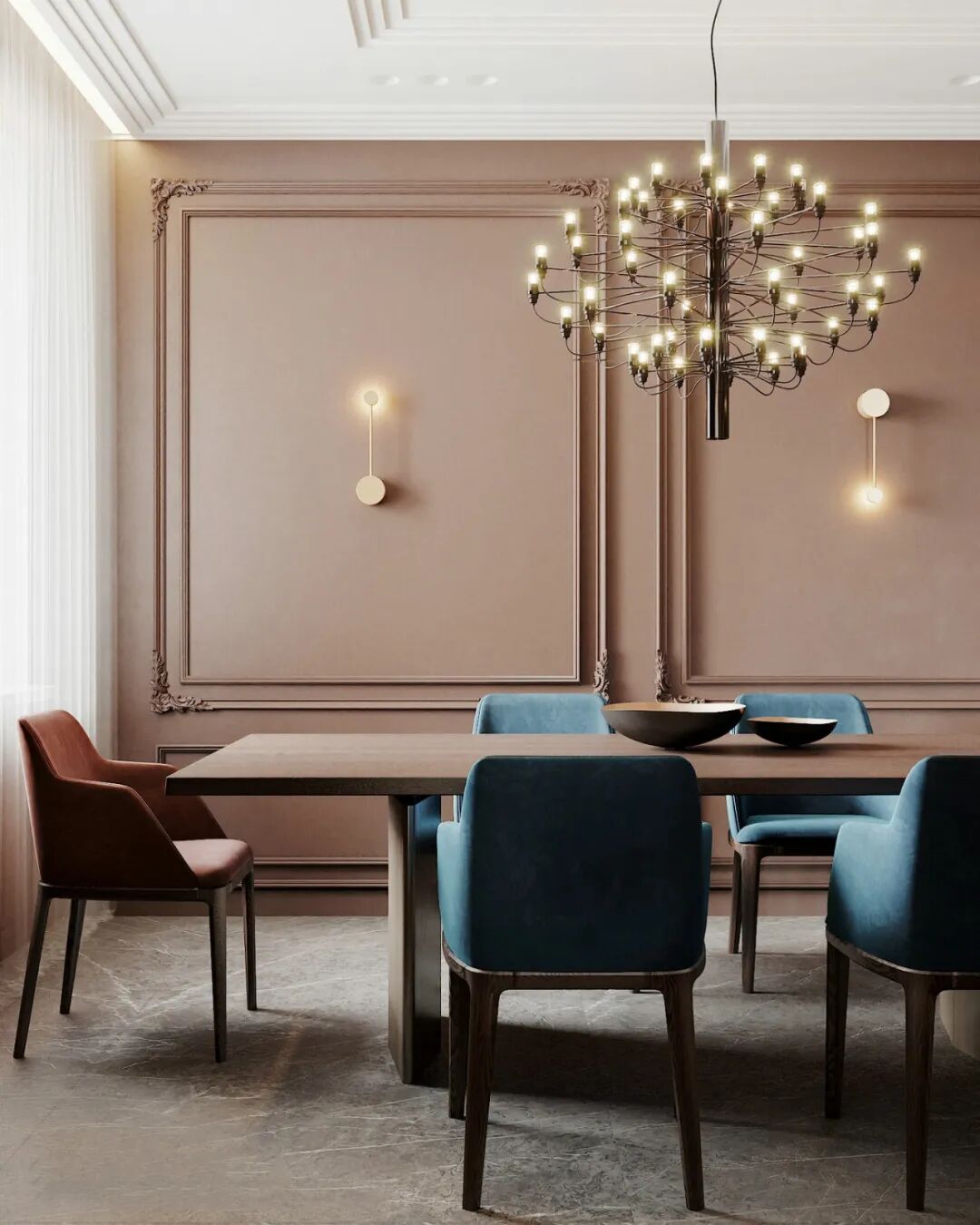 公领域空间以开放式为格局,客厅与餐厅互通,让空气与光线在空间中自由流动。餐桌的吊灯增添了空间的设计感。