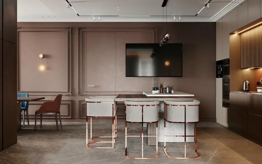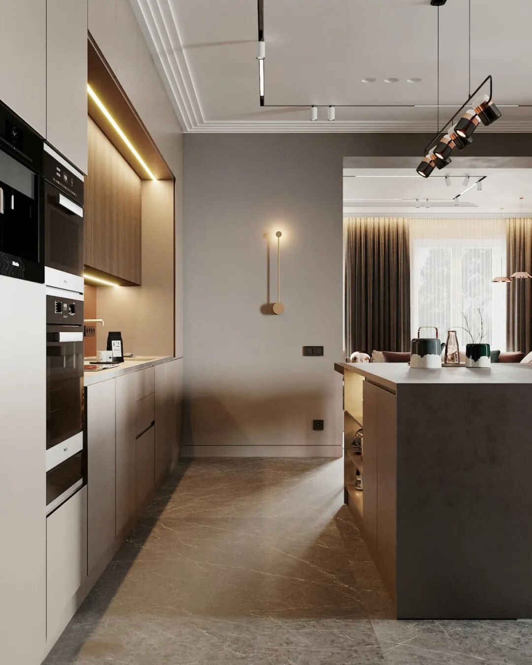 厨房设计成这样,不仅仅满足日常功能的需求,也让下厨变成了一种享受,既是吧台,也是隔断,白色的台面在顶部的吊灯的渲染下,很贴合室内风格。