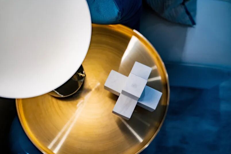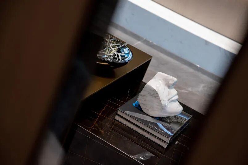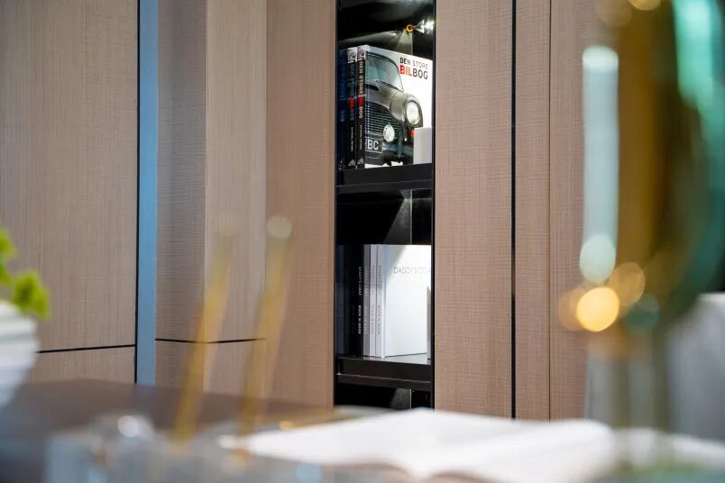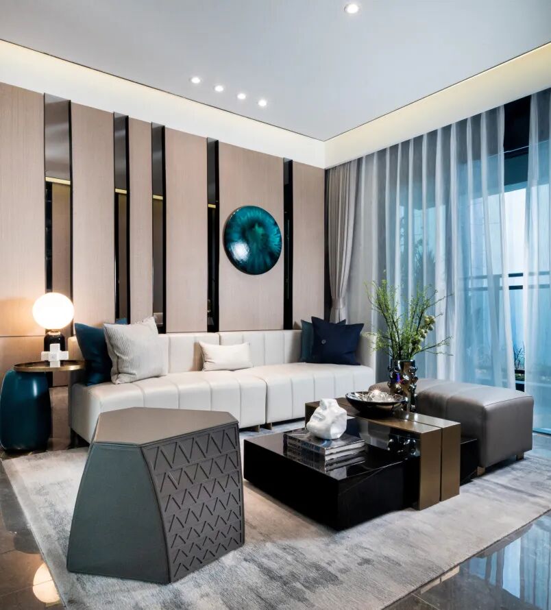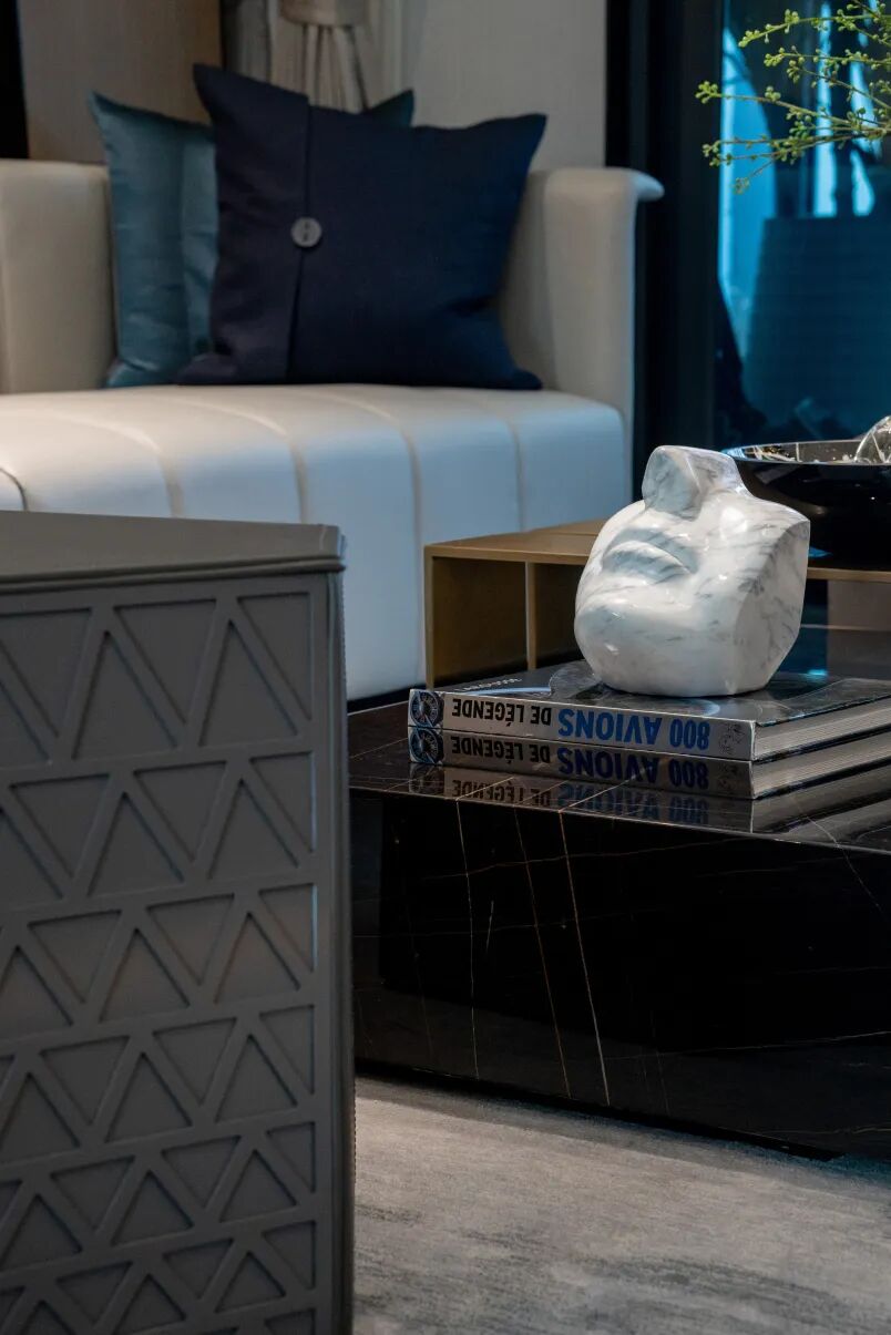 客厅错落间隔的护墙板以矩阵形式排列,进一步提升空间的质感与尊贵,仿佛一切经由熨烫后的挺括,呈现出鲜明的结构感。电视早已不再成为娱乐中心,人与人之间的情感交流成为空间设计的关注点。