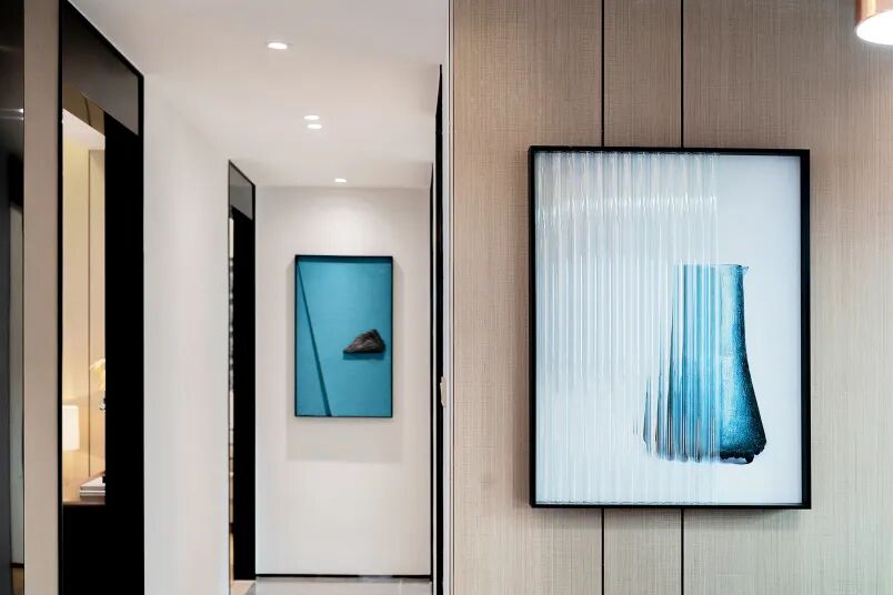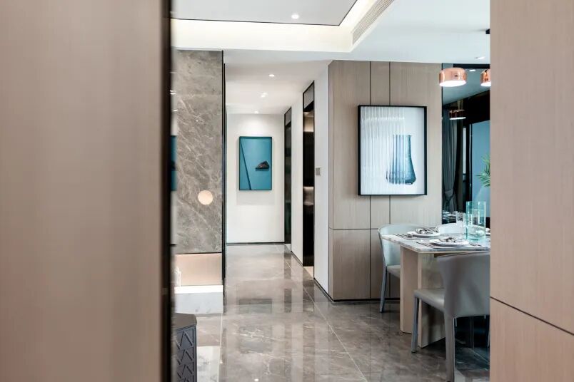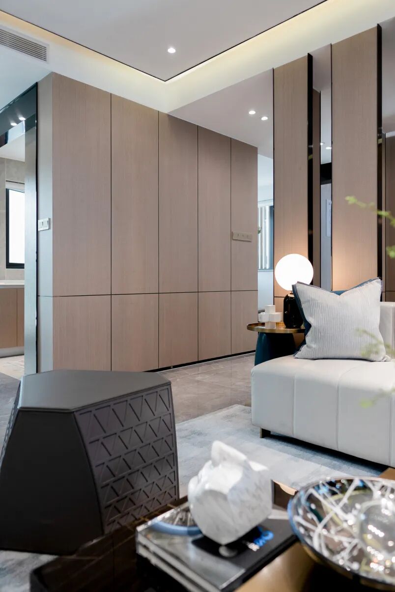 设计师眼中的家,不仅供人居住,更是心灵栖息的圣地,以其丰富的内涵传达出对生活的态度。进门玄关,抛去华丽喧嚣的装饰面,一幅艺术画、若干小摆件映入眼帘,视觉以雅致的木饰面暗暗加强端庄感,挑起人们深入探索的好奇心。