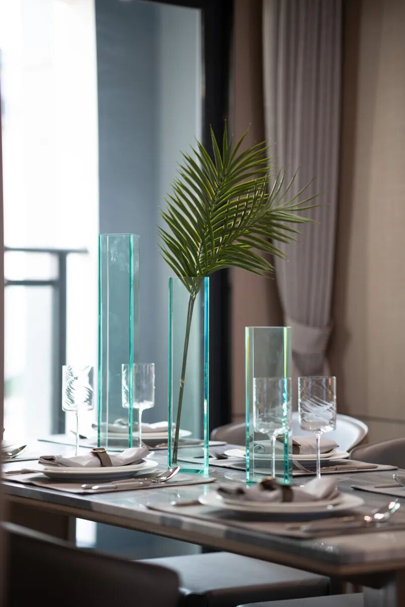 餐厅延续低奢格调,与客厅相呼应,保持视觉上的高度统一,金属、玻璃与皮质的巧妙搭配,体现了屋主的高级品味,时尚而精致,明亮通透的格局总能带来轻松愉悦的好心情。