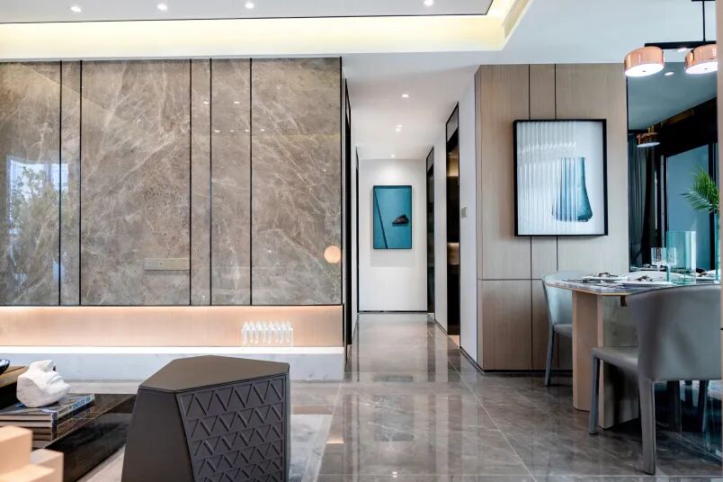背景墙装饰低调轻奢,大理石的天然纹理于细节中彰显质感。联动餐厅区域,大面积的落地窗,展露出室内外景观互动的珍稀性,在设计语言中,也增加了“虚实对比”这一重要表现形式。