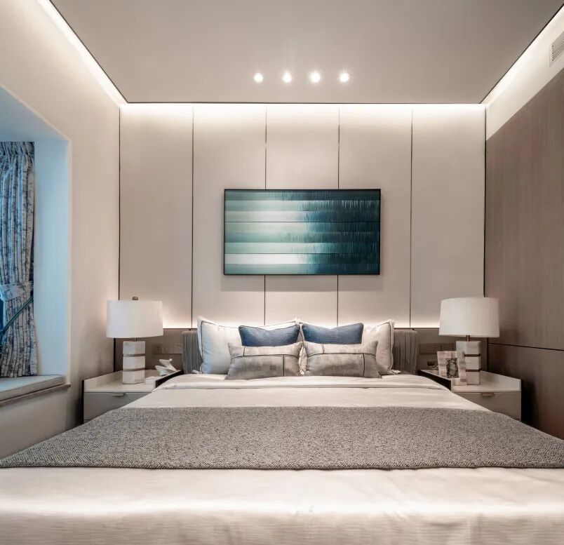 主卧与整体空间保持一致,摒弃传统的天花样式,去掉繁琐的吊灯,让整体空间更加舒展与明快。加上床头的挂画,以后现代风诠释空间的艺术氛围,成为空间的视觉焦点。木地板与布艺搭配,融入自然元素,使空间更具有生活的气息,温馨柔和又不失精致前卫。